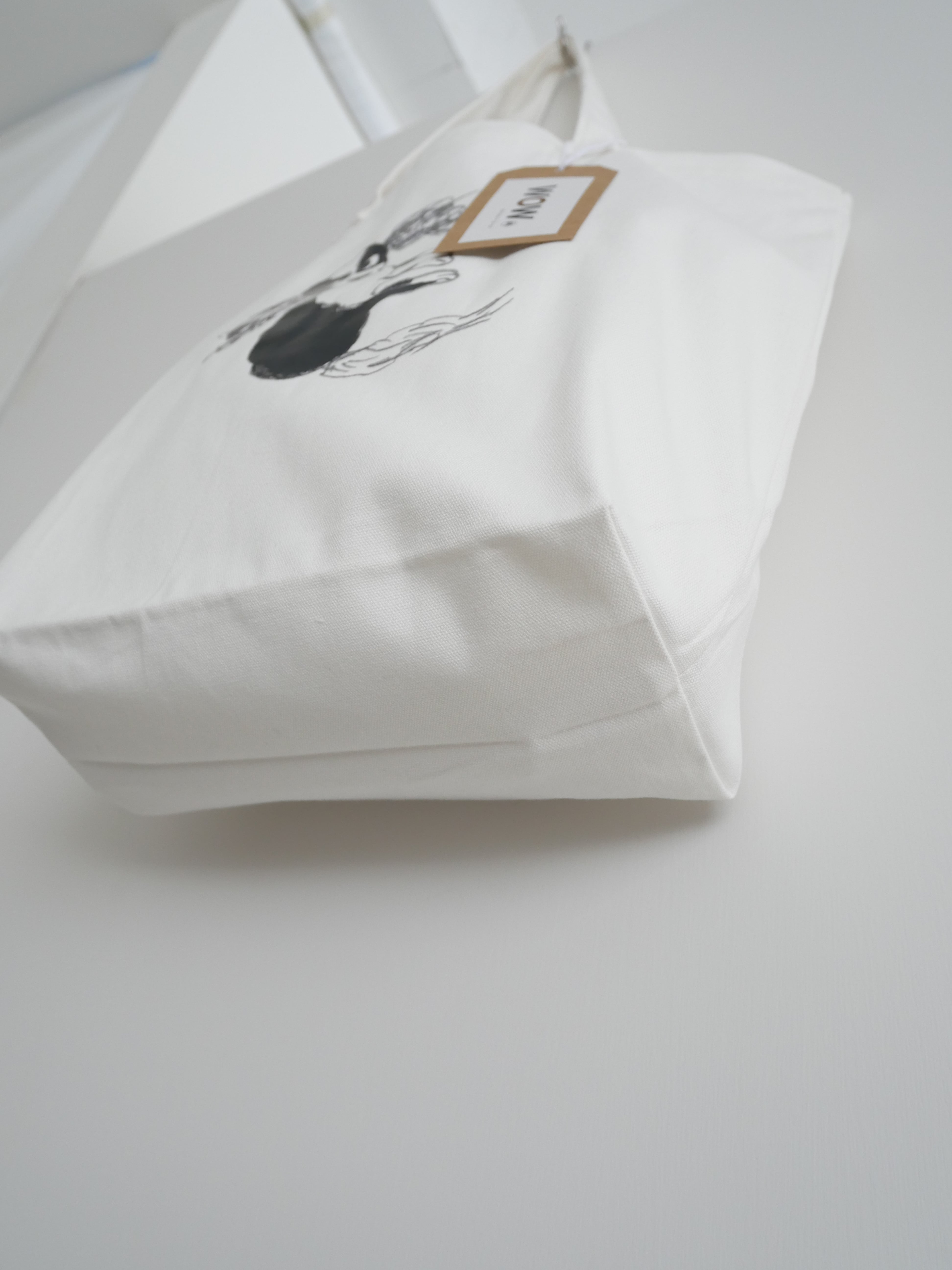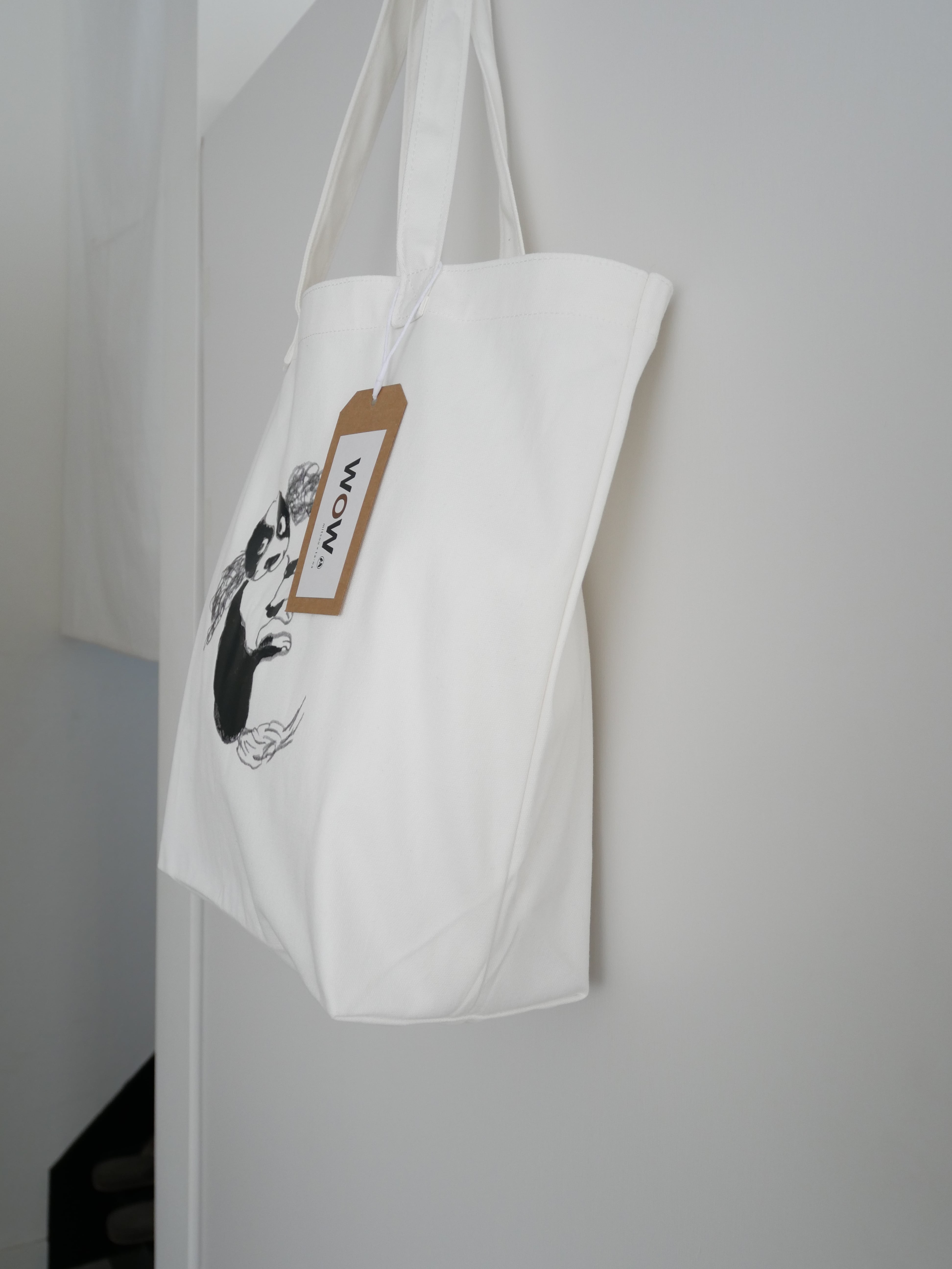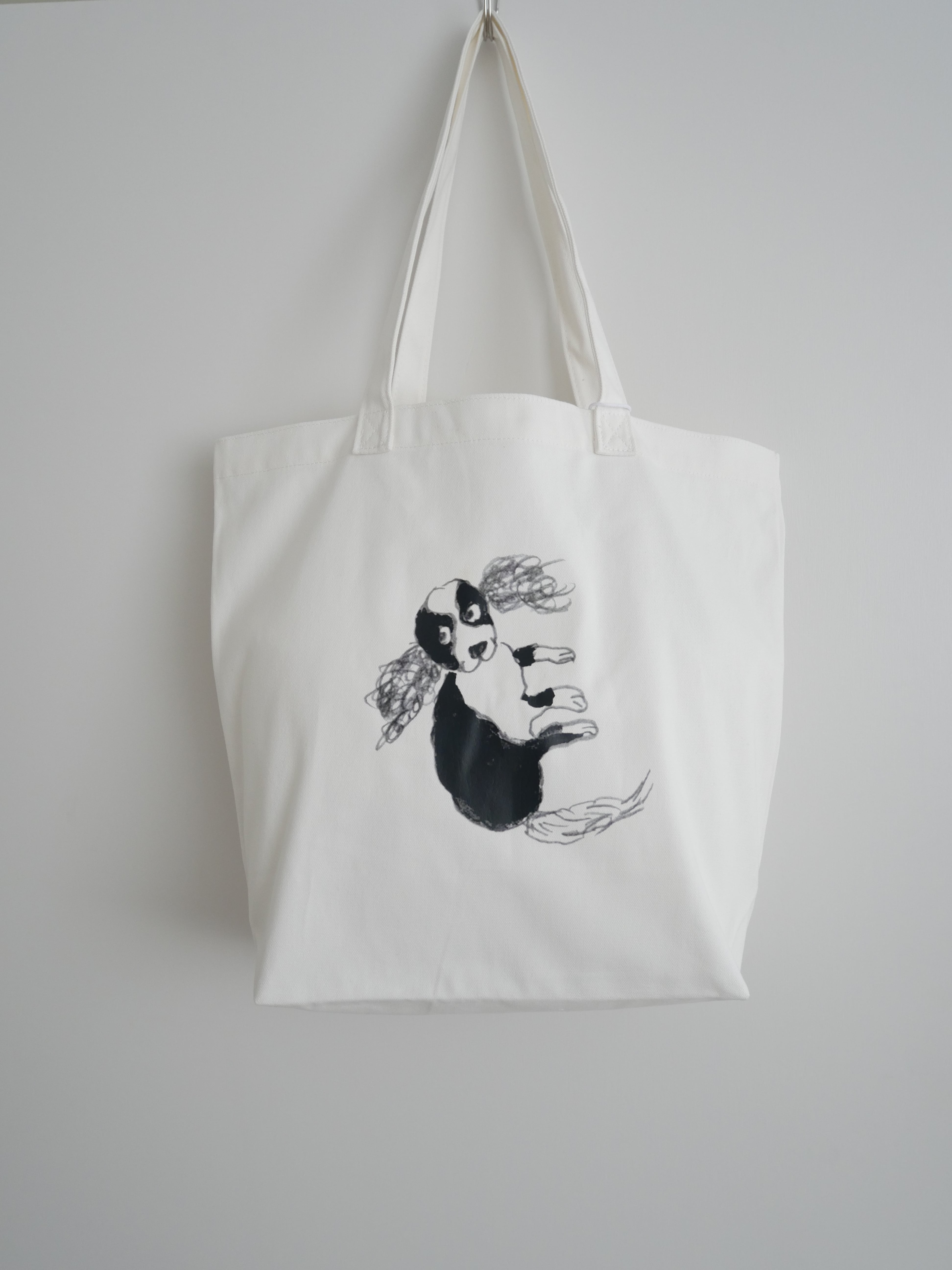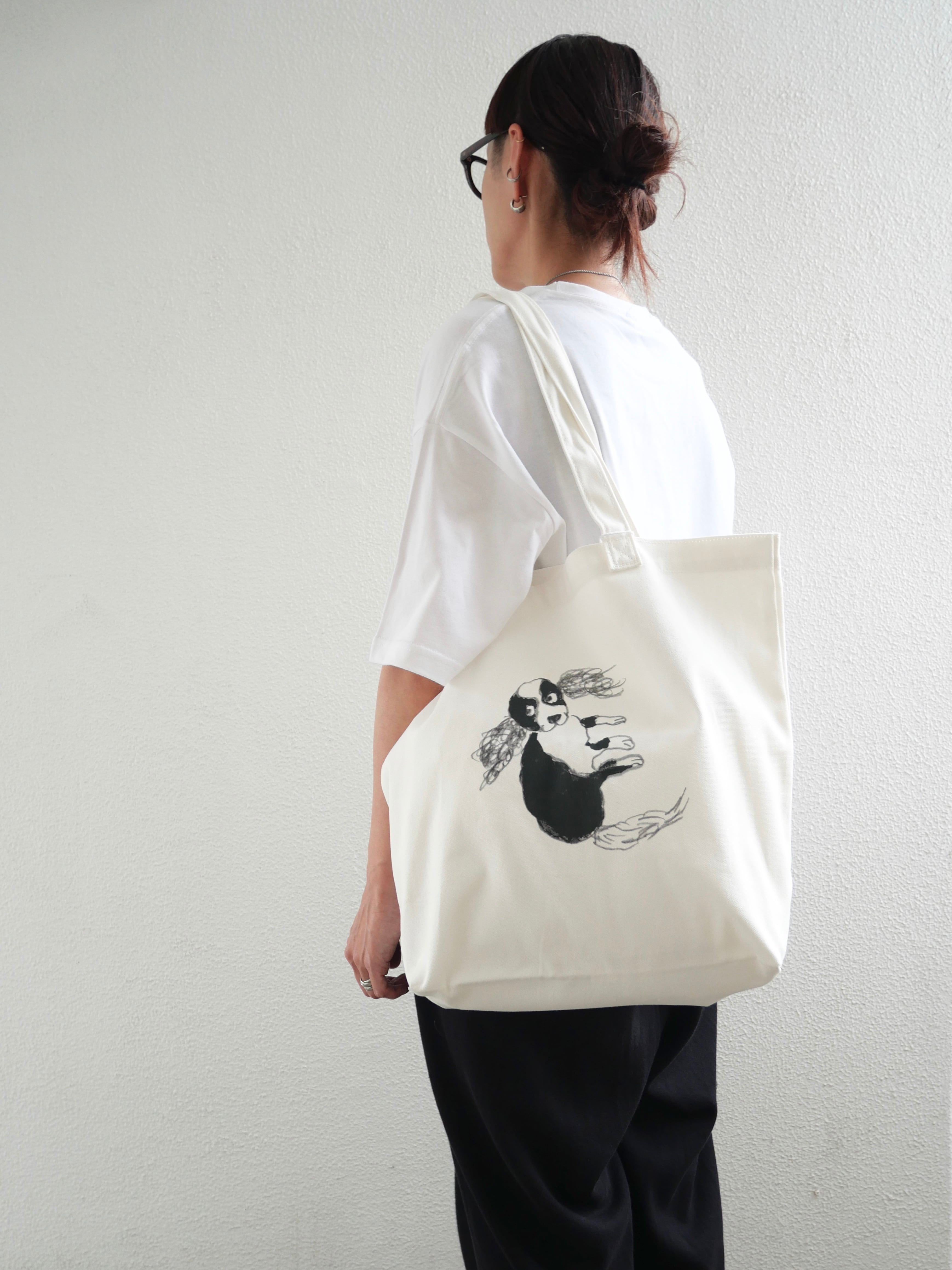大きめの真っ白いバッグはそれだけでも存在感がありオシャレですが、mitsouさんのシュールなイラストが個性的で、コーディネートのポイントになるアイテム。