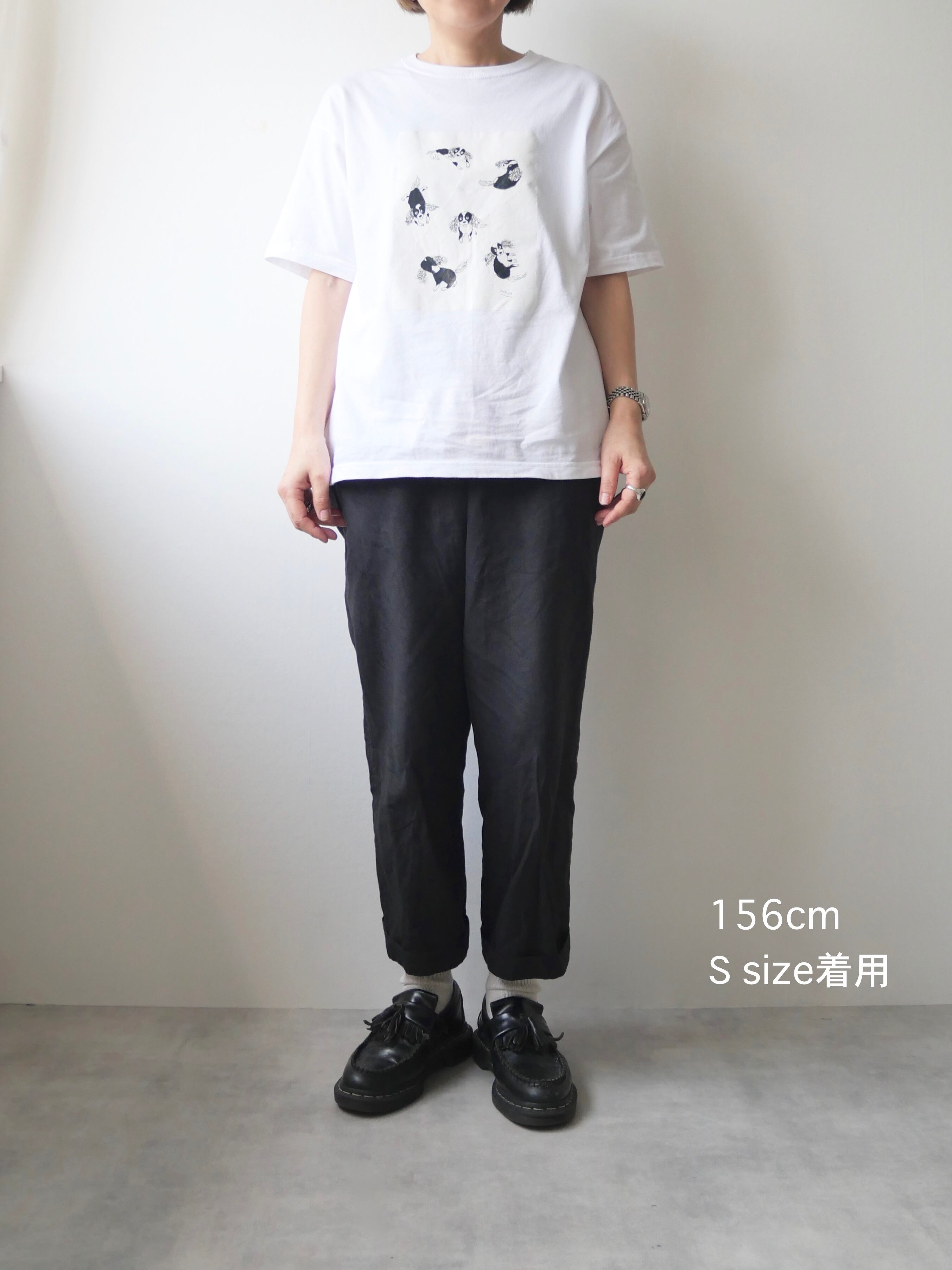 身丈・身幅・肩幅のバランスにこだわった抜け感が魅力のTシャツにmitsouさんのシュールなイラストをプリント。老若男女の幅広い方々に着ていただけて、大人かわいい、ツルっと光沢のあるプリントでカジュアルになり過ぎないTシャツを目指しました。