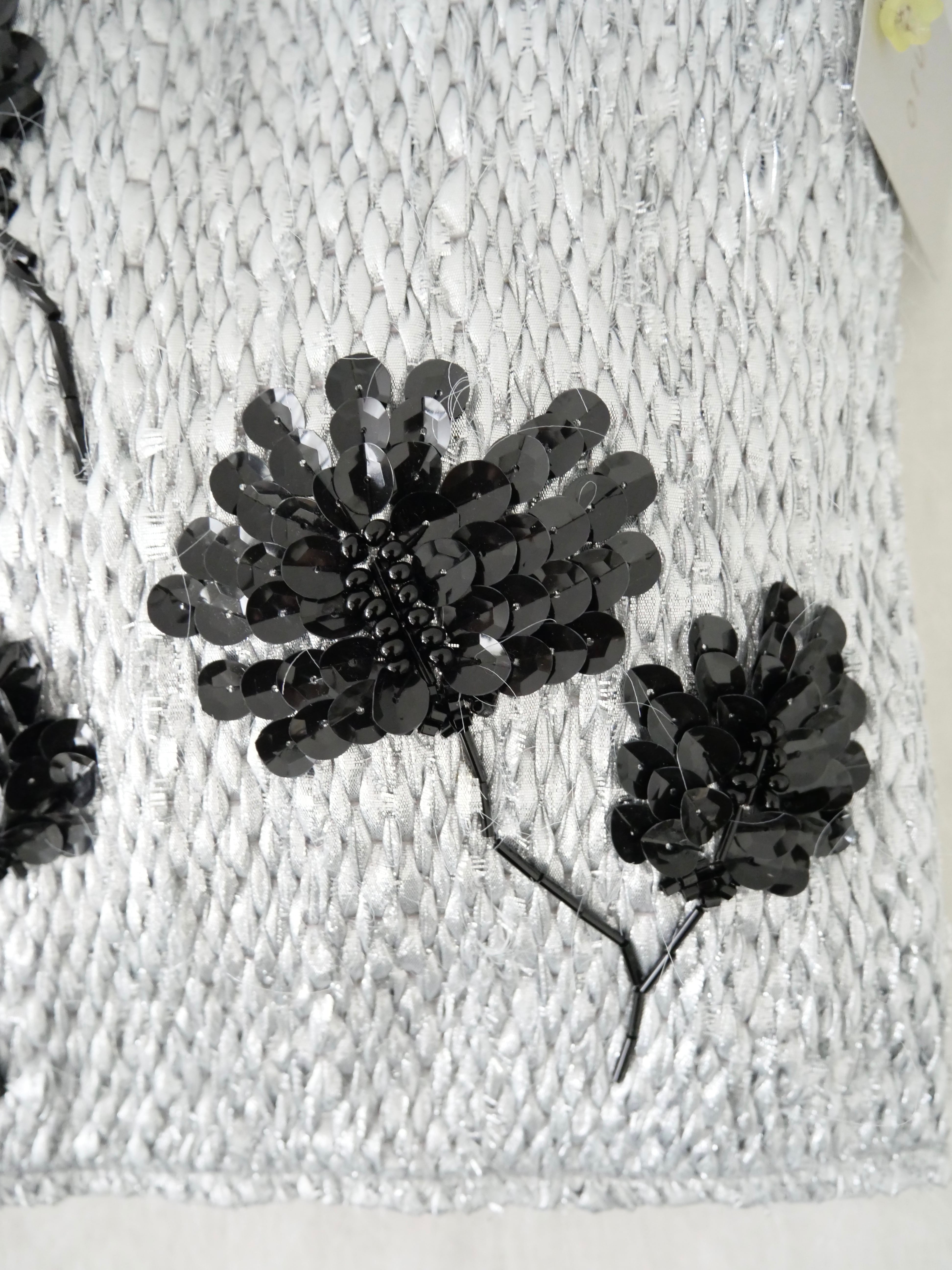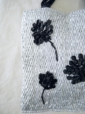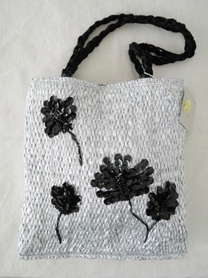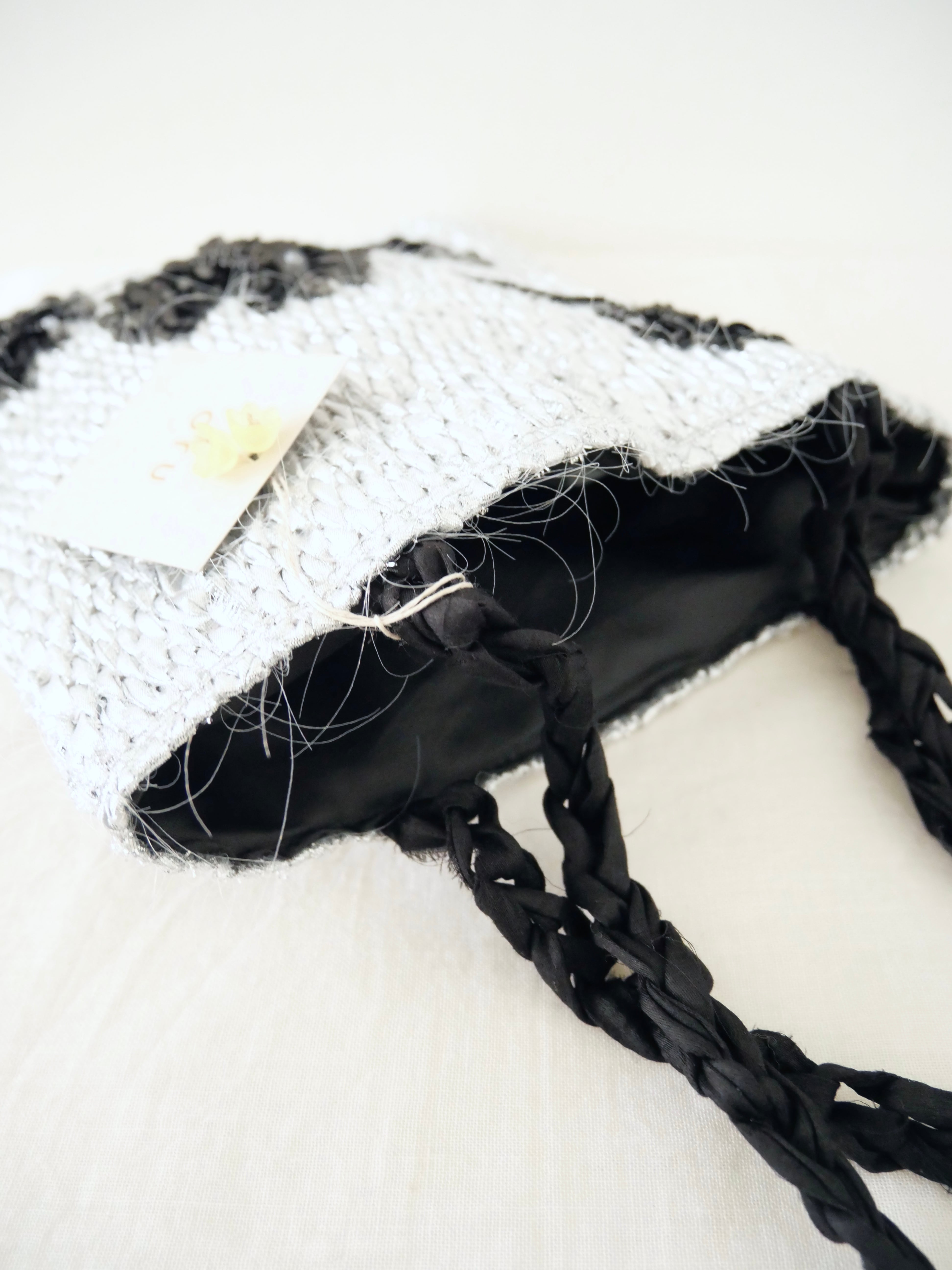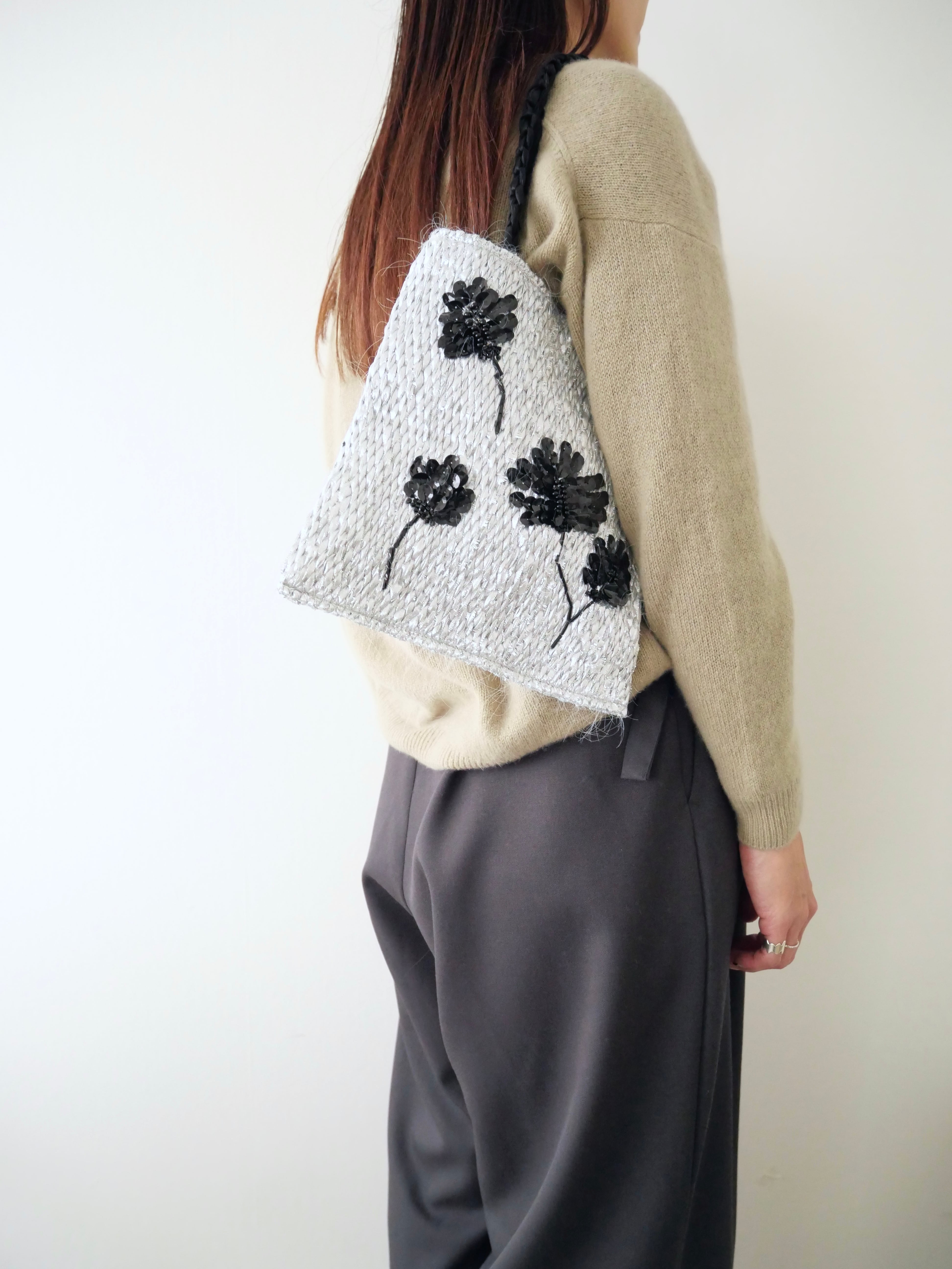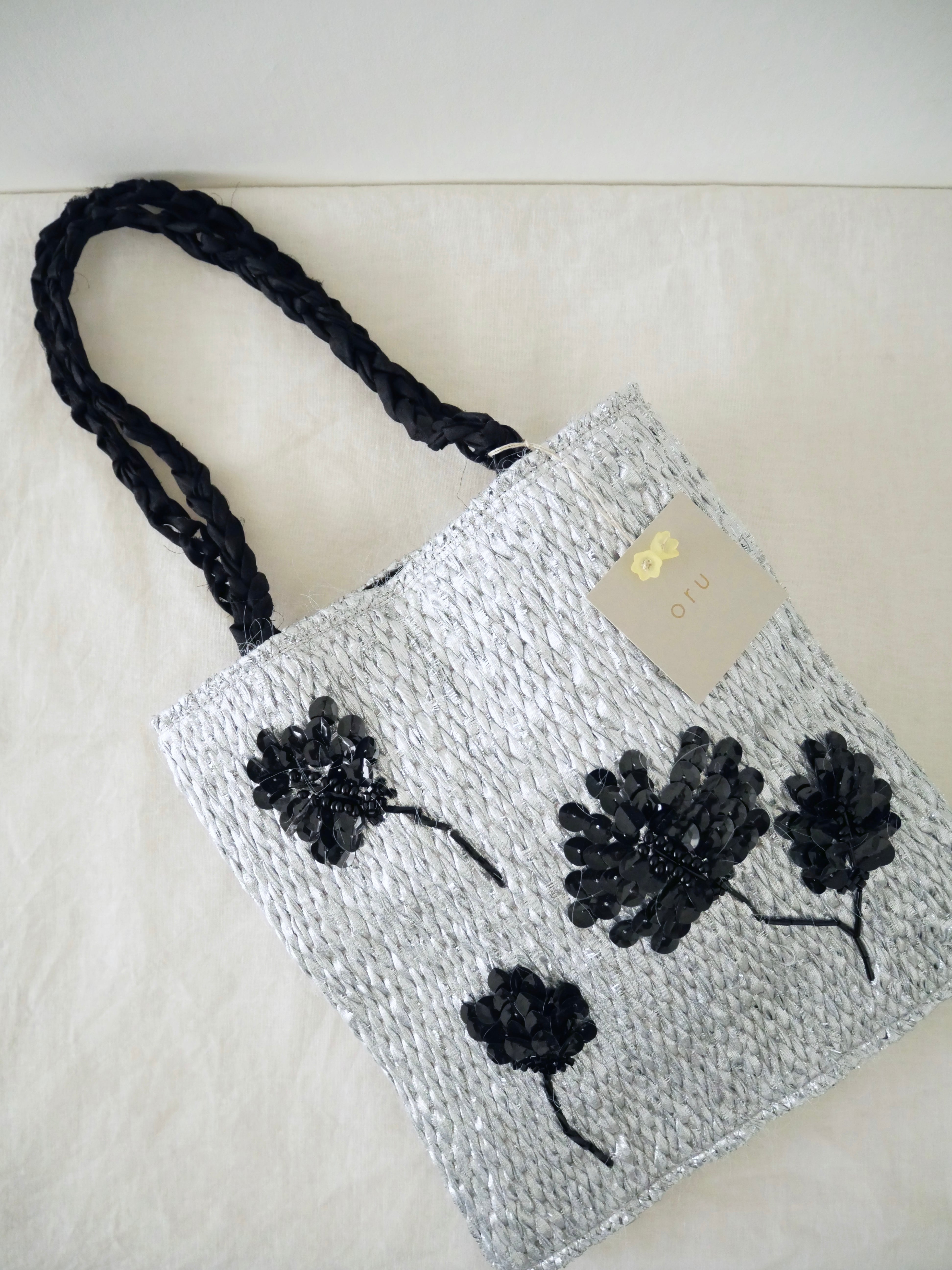 細く切った布を手織りしてバッグに仕立て、ビーズでお花のモティーフを作りました。