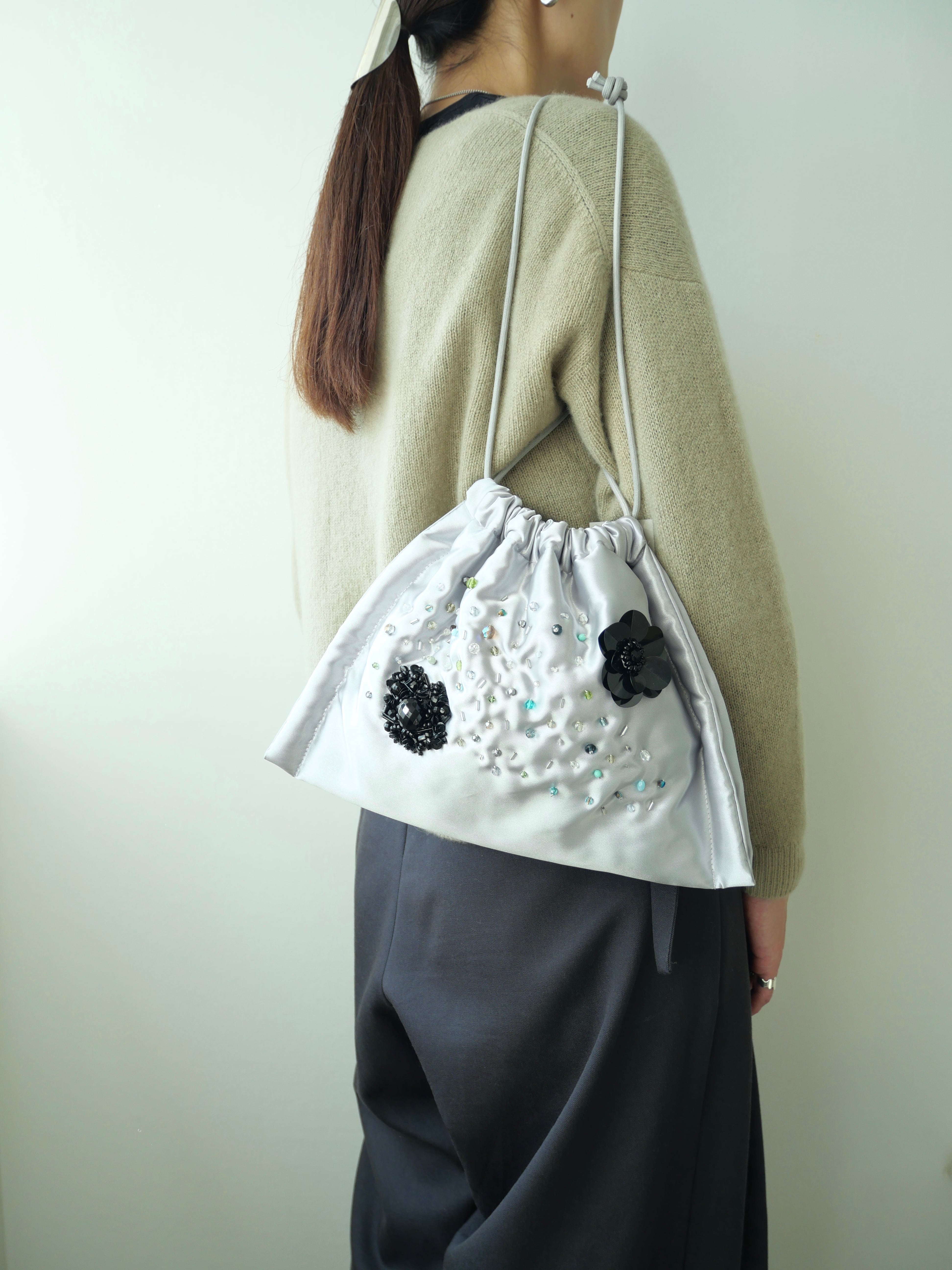 サテン生地の中綿入りふわふわ巾着バッグに、ビーズとスパンコールでキラキラの花を作りました。
