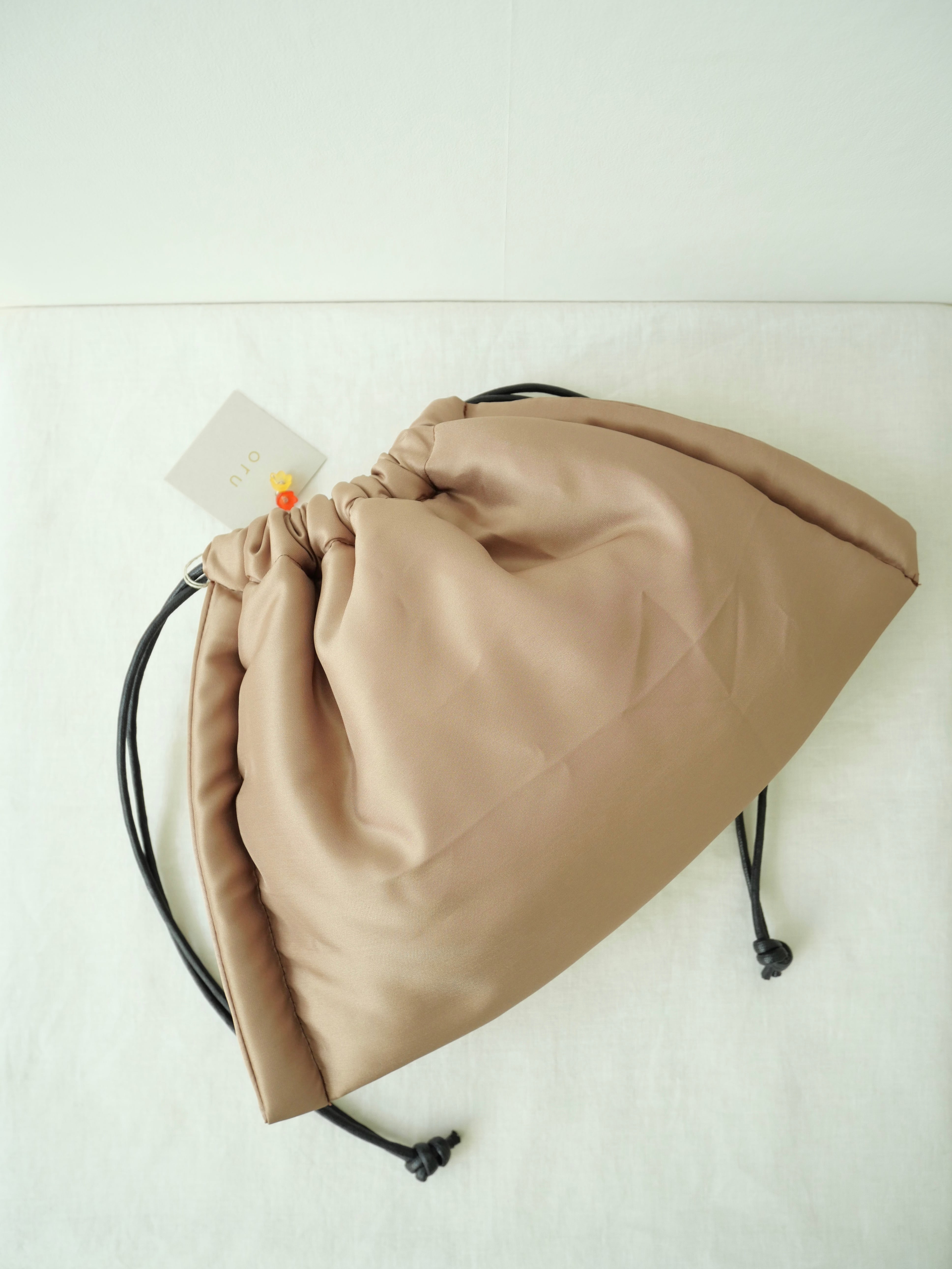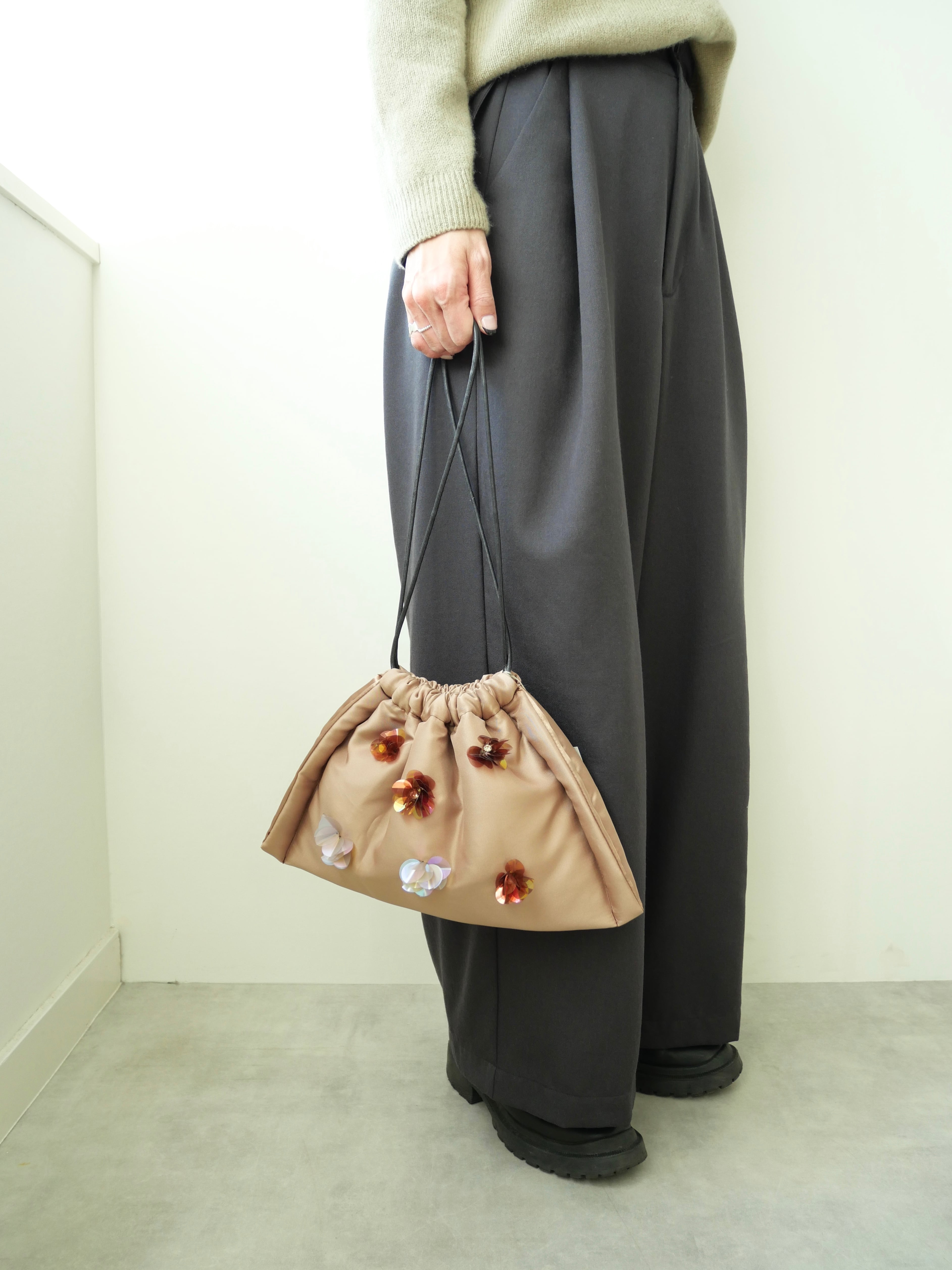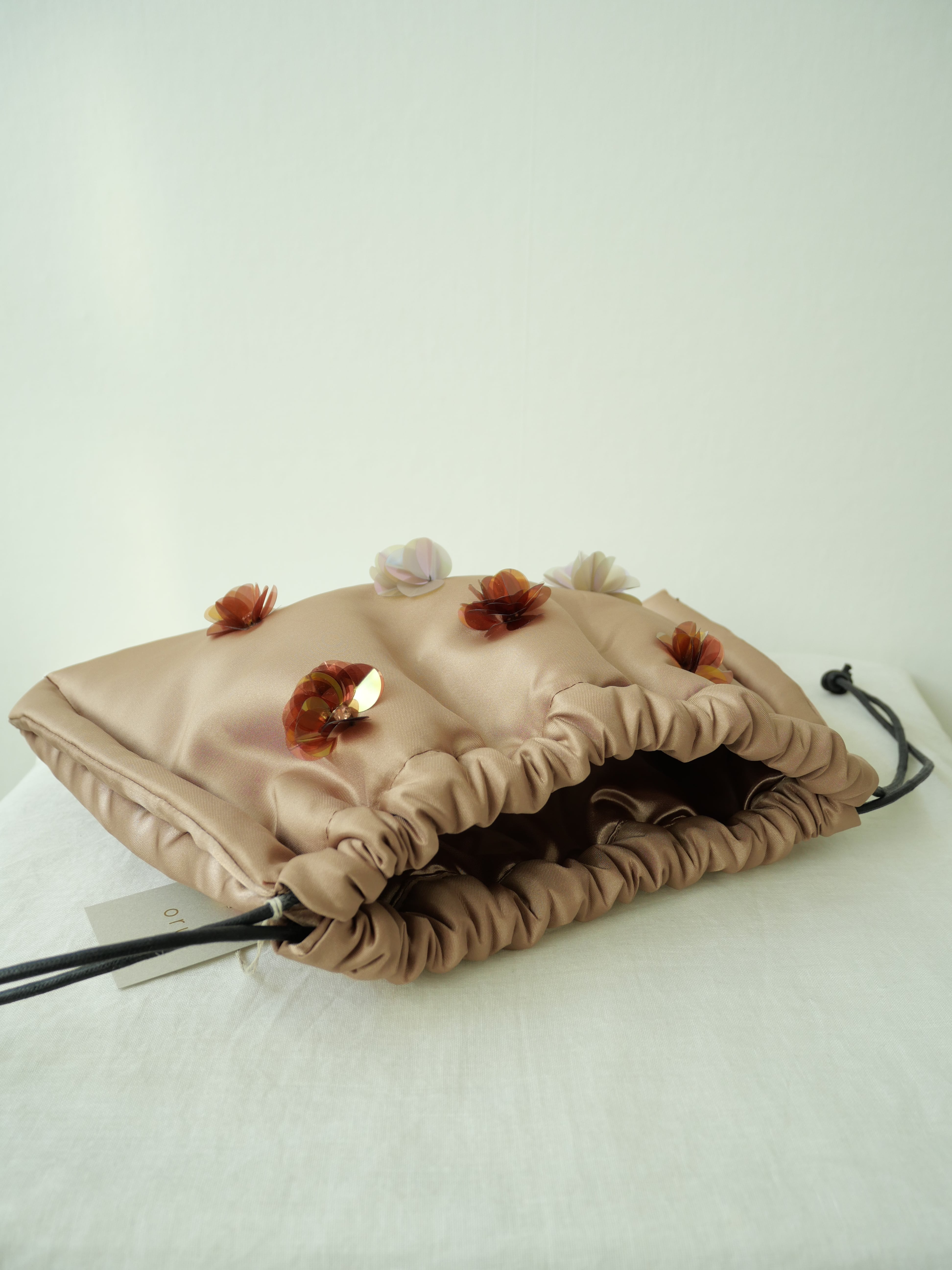サテン生地の中綿入りふわふわ巾着バッグに、ビーズとスパンコールでキラキラの花を作りました。
