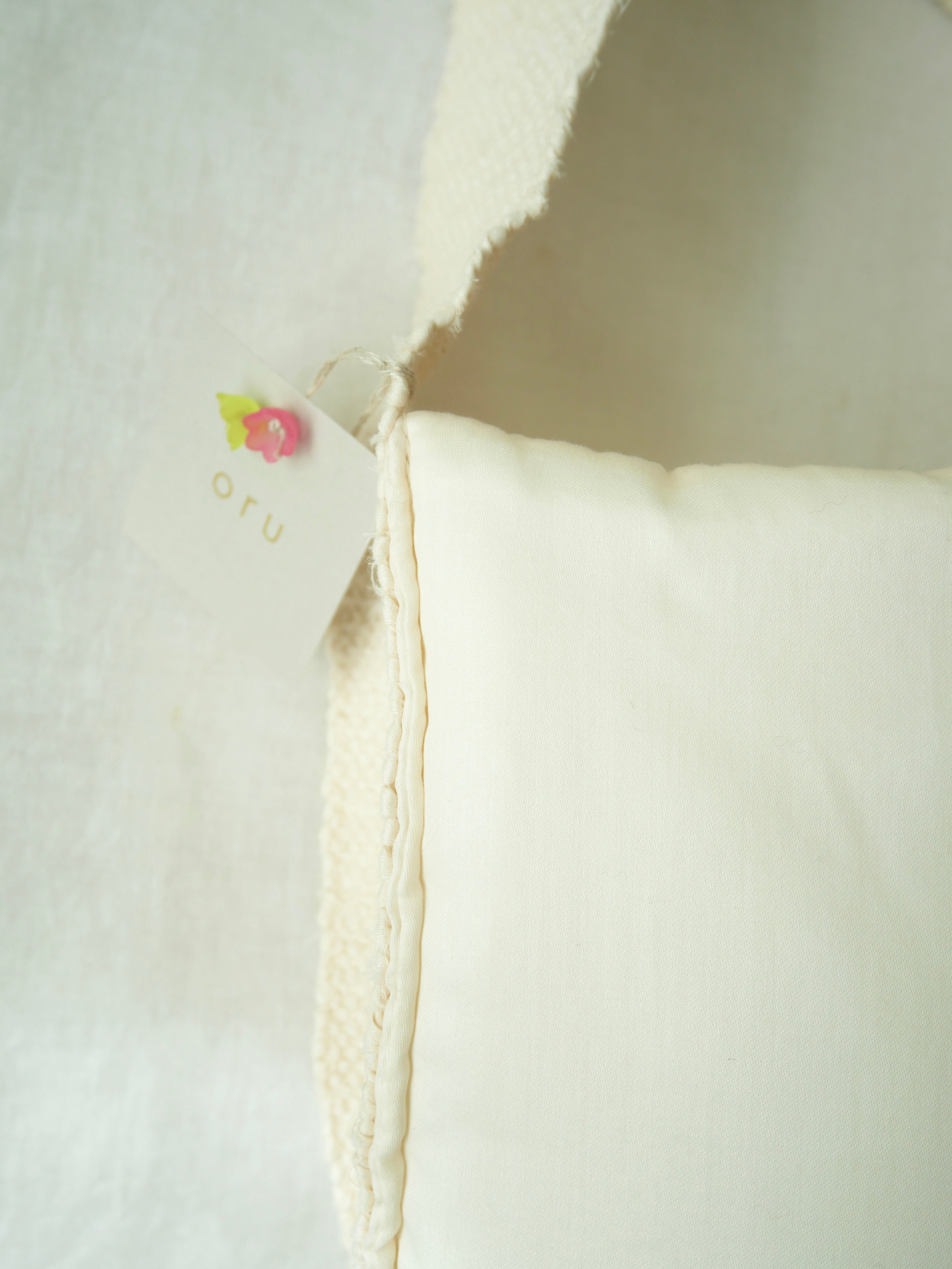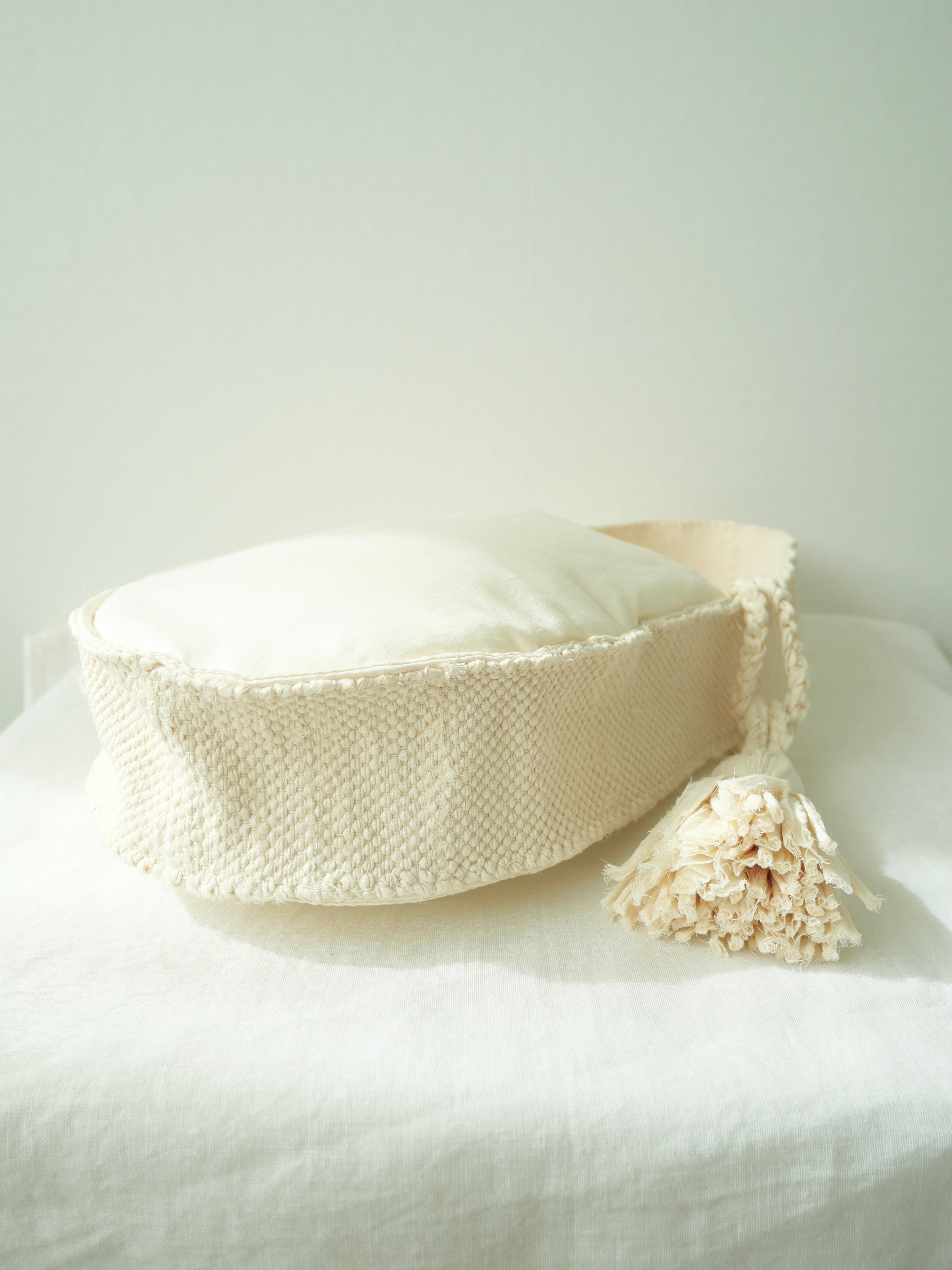 手織り(裂き織り)を合わせて、中綿入りのふっくらとした卵みたいなバッグを作りました。手作りのタッセル(取り外し可能)も付けました。