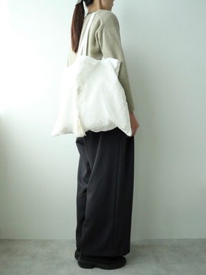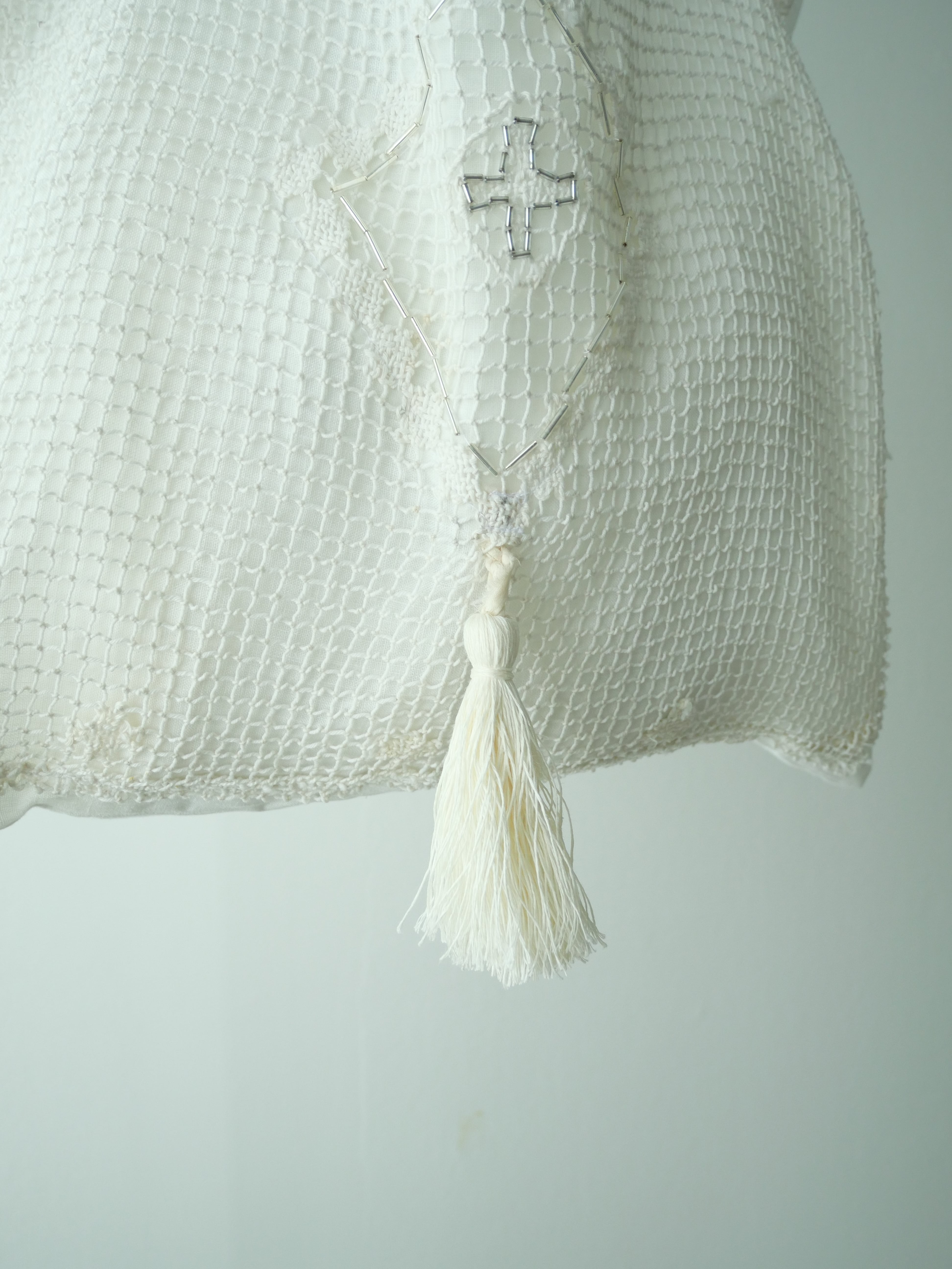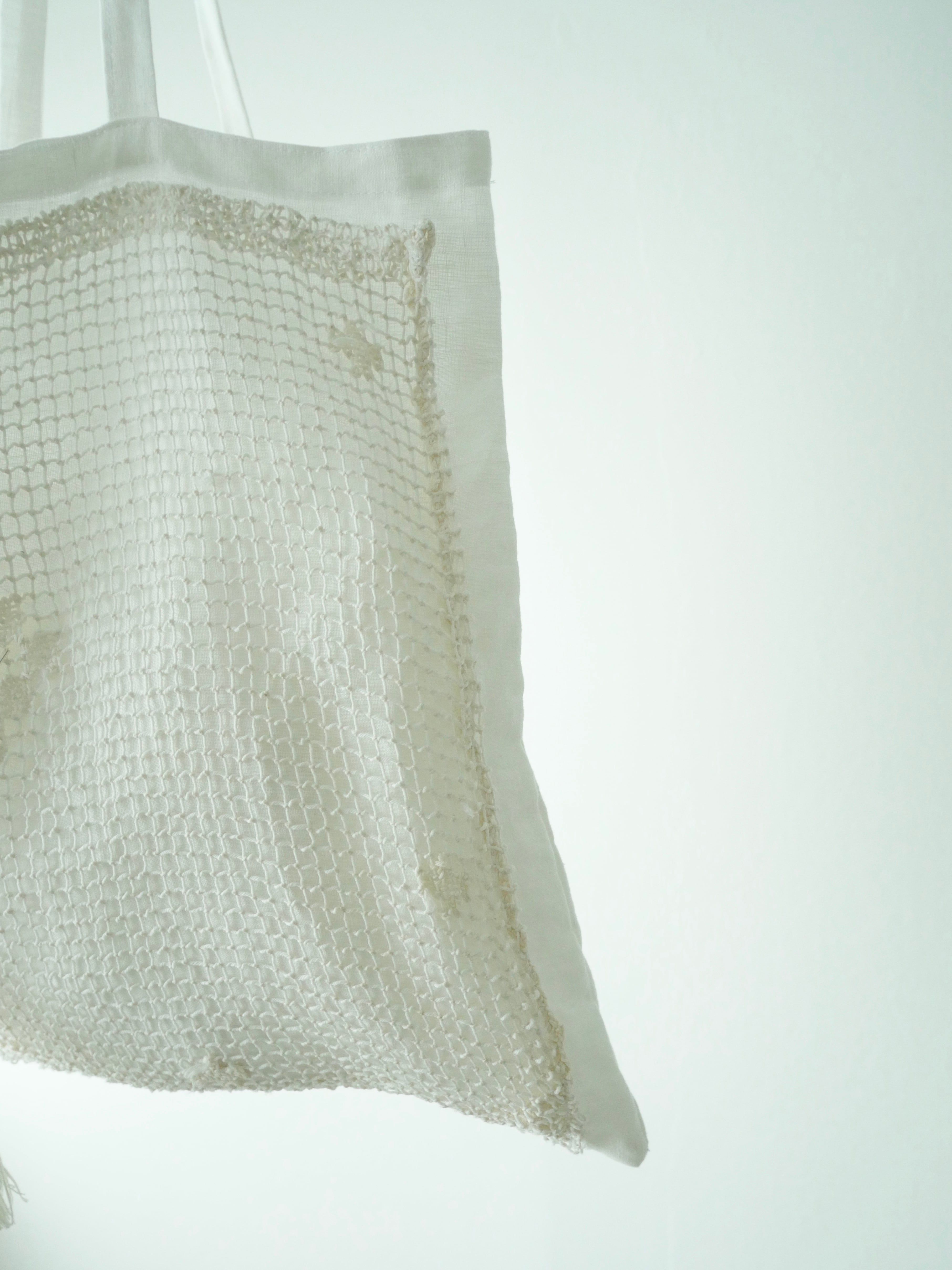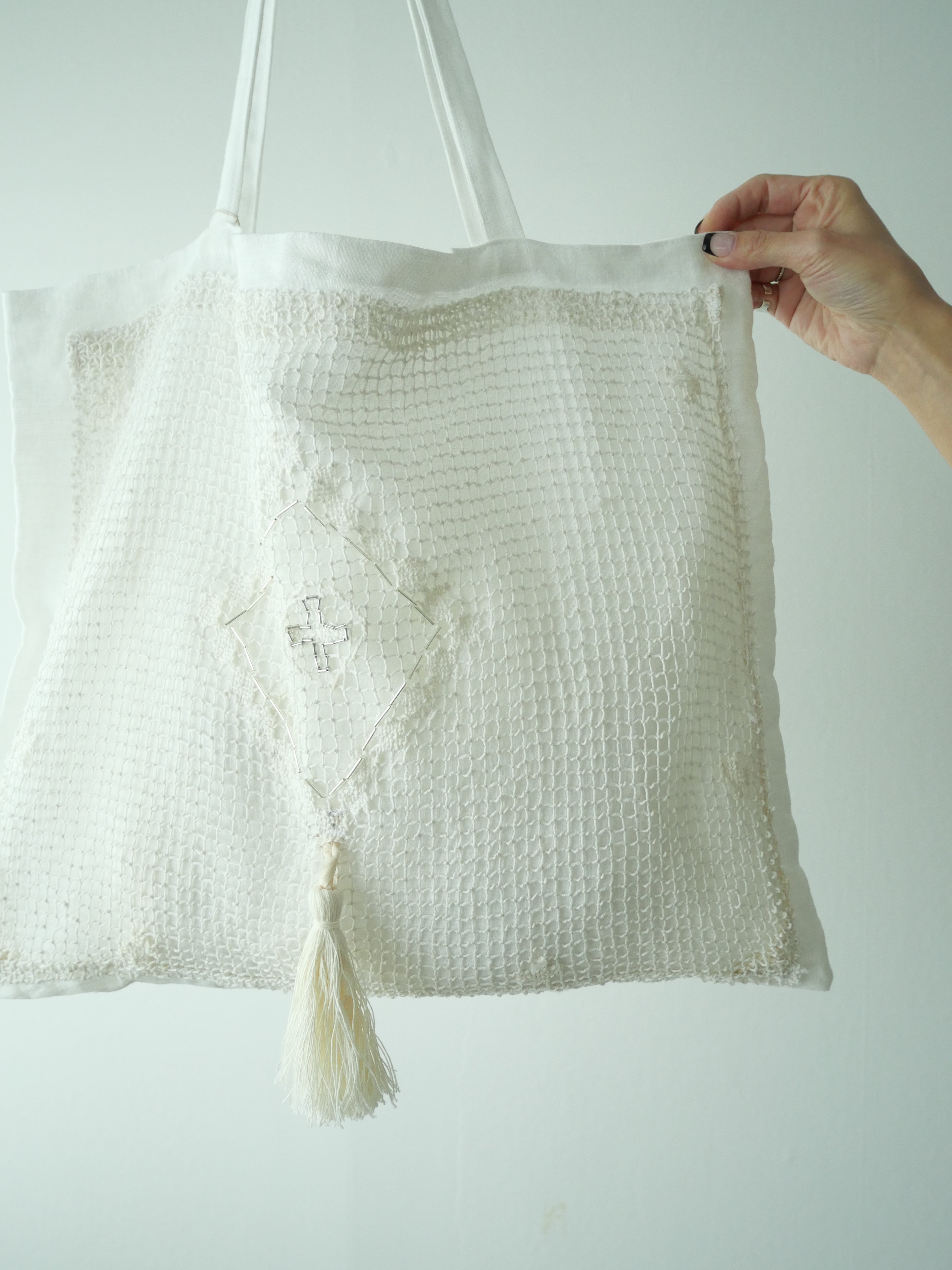 リネン生地のバッグにアンティークレースをつけて。ビーズとタッセルをポイントにしました。