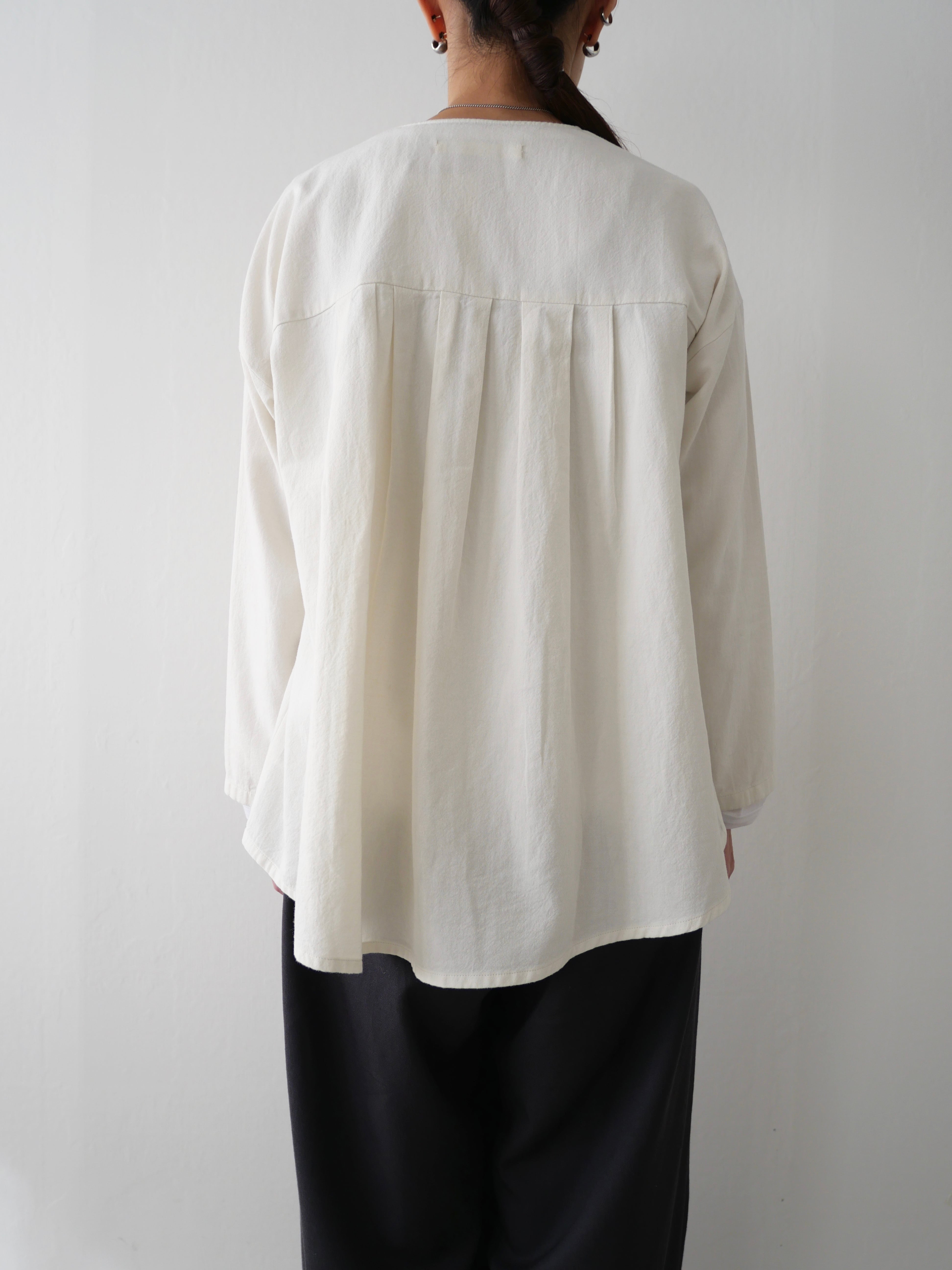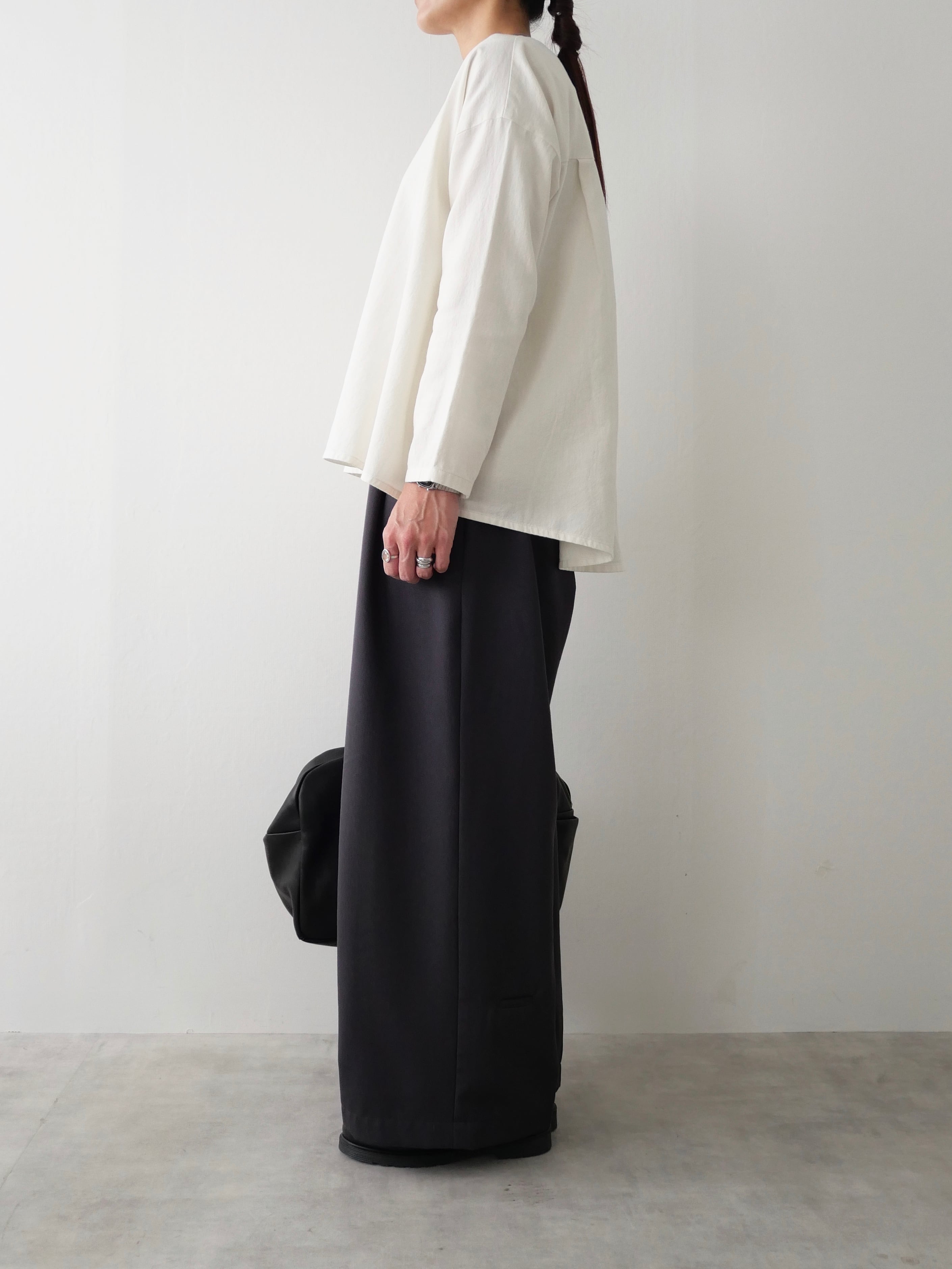 コットンとウールの混紡糸で柔らかく織り上げた、ほのかな毛羽立ちと暖かみを感じる生地です。ニットベストやプルオーバー、カーディガンとのコーディネートに重宝するアイテムです。後ろに入れたタックが柔らかなシルエットをつくり、華やかな印象にしてくれます。