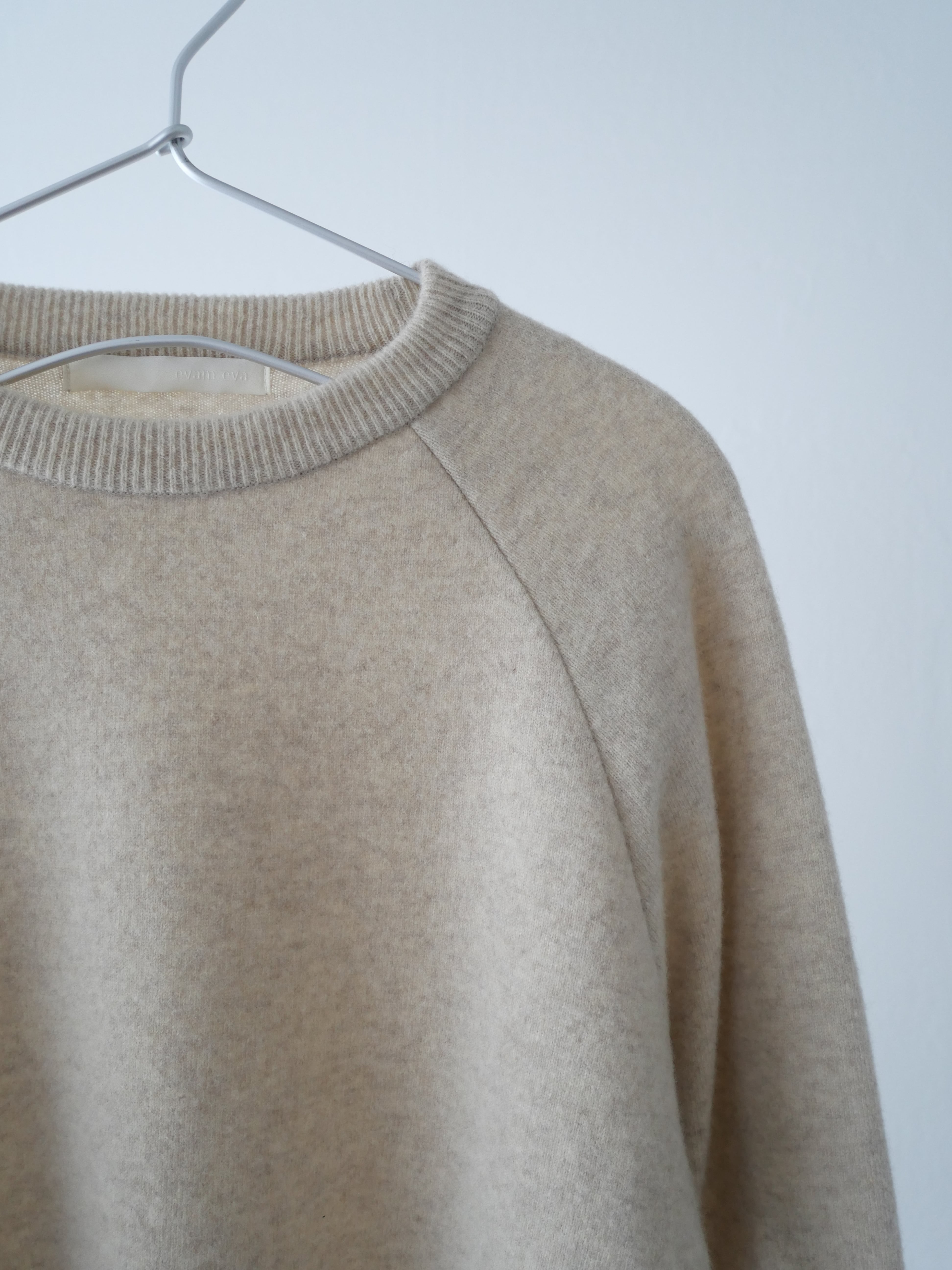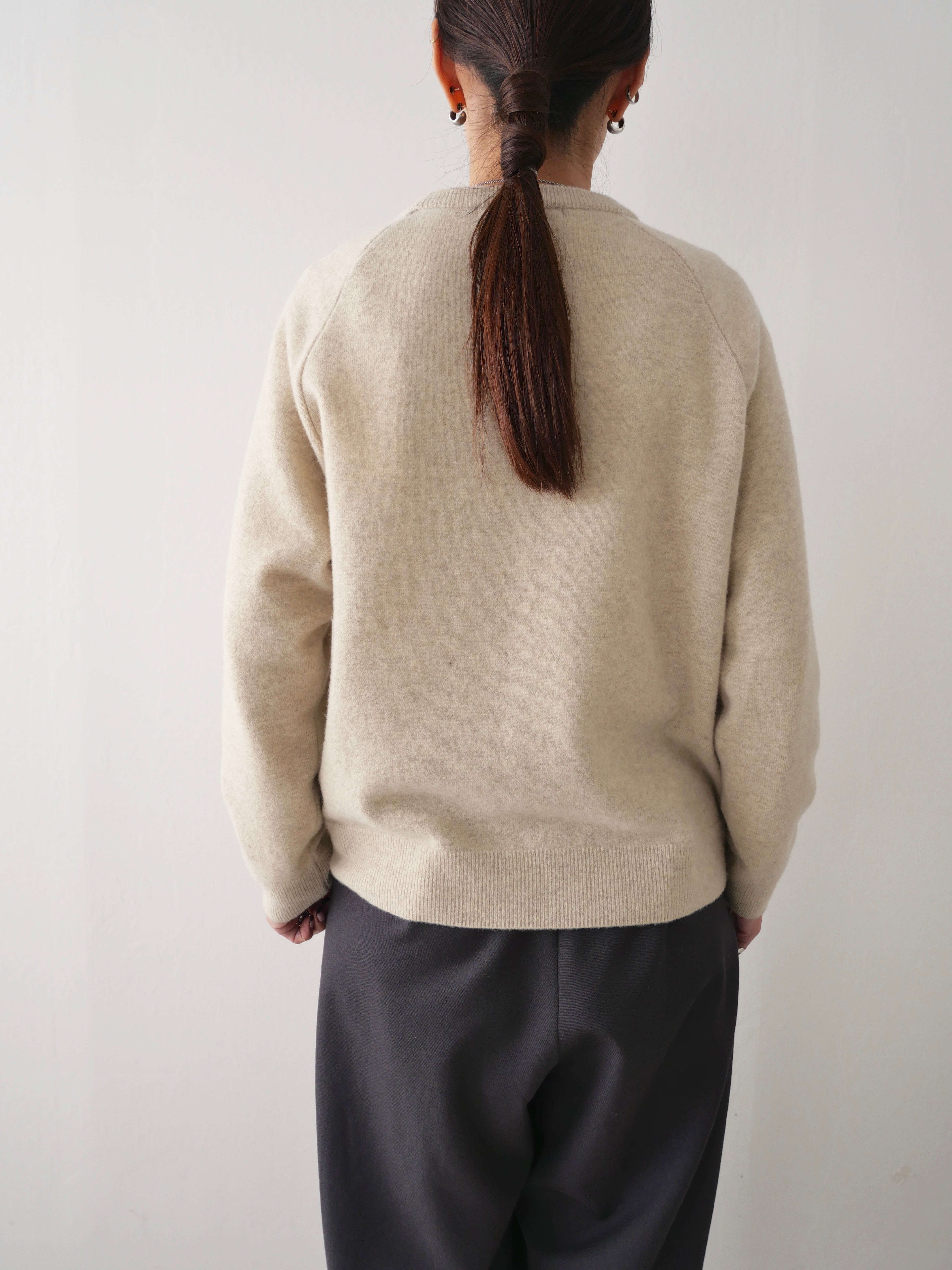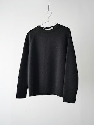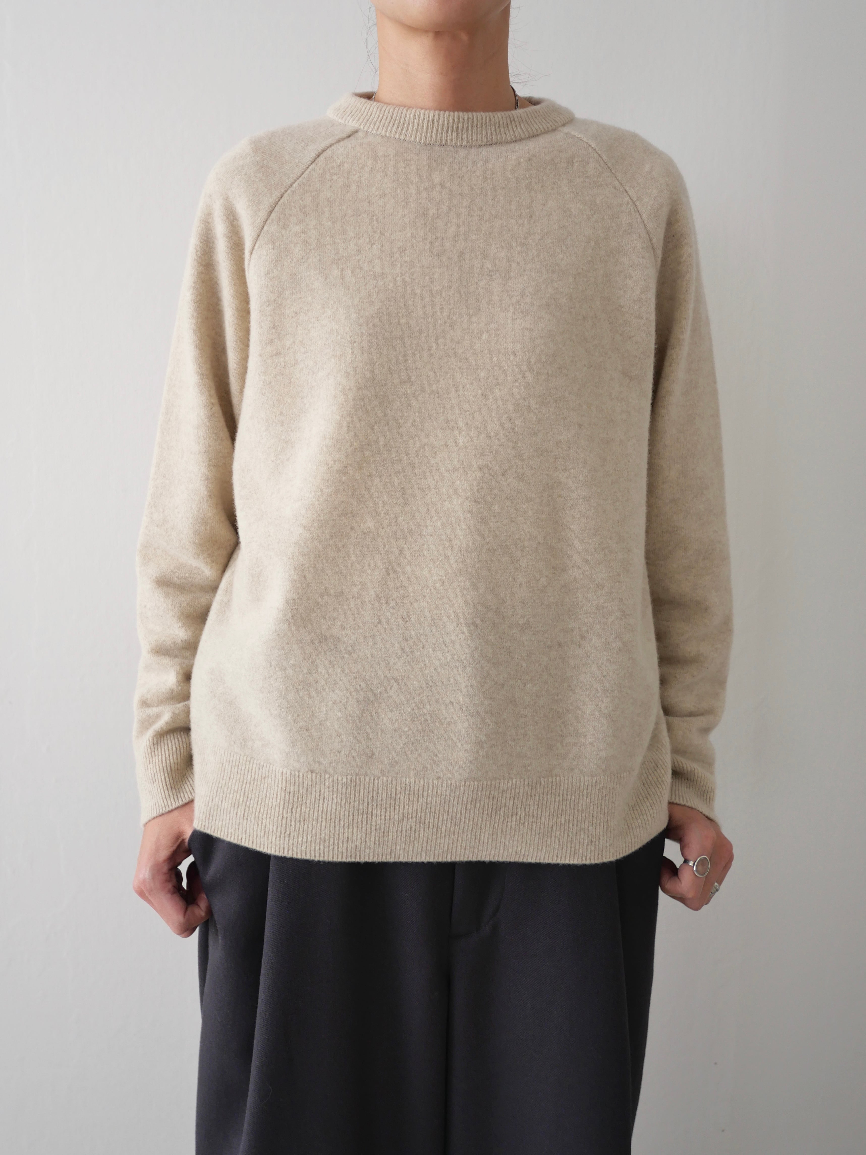 膨らみの良いメリノウールを強縮(プレス)加工して仕立てたラフな印象のニットです。カジュアルさを抑えた上質な大人の着こなしにおすすめのシリーズです。ラグランスリーブは、腕周りゆったりと着ていただけます。