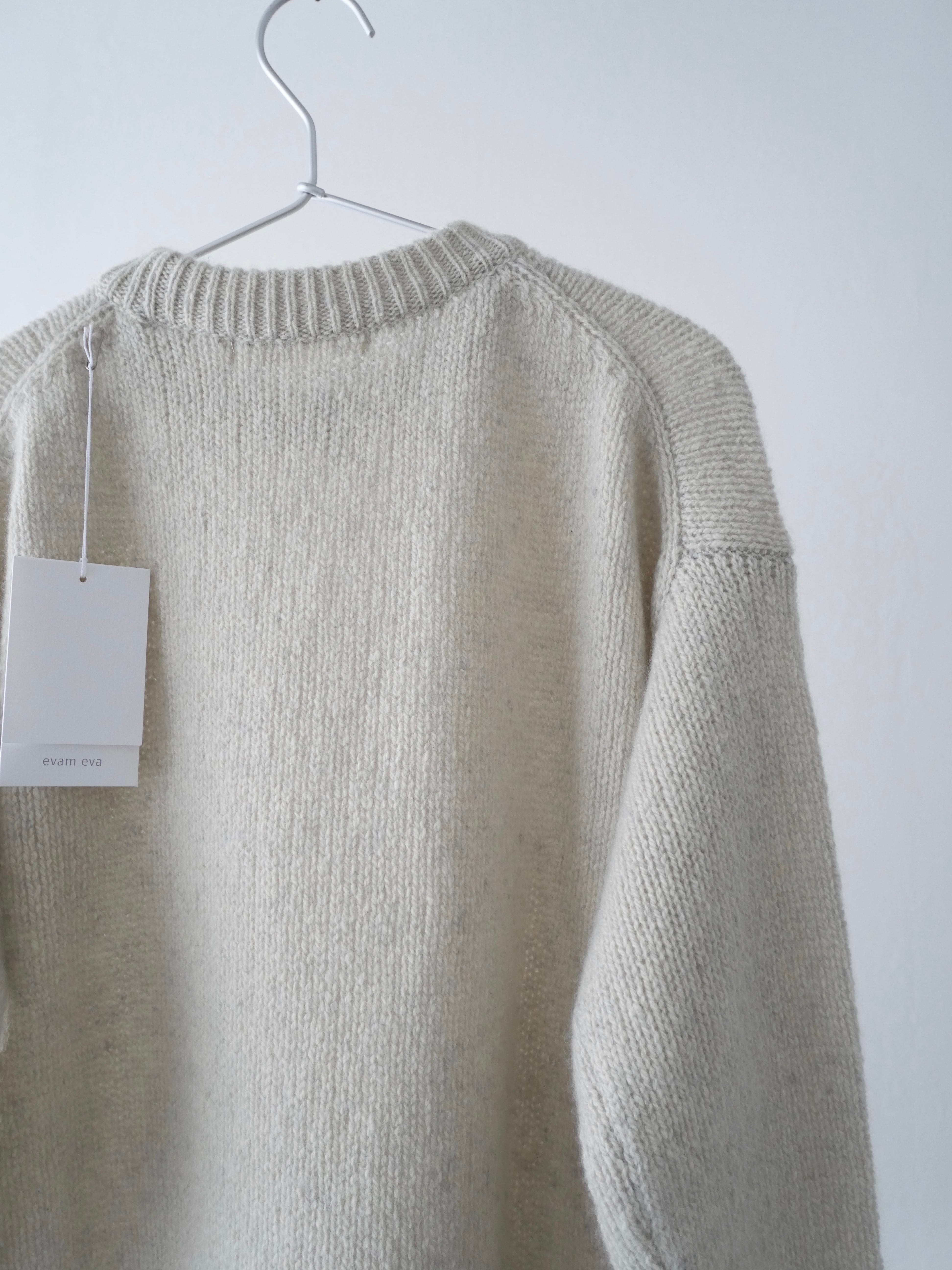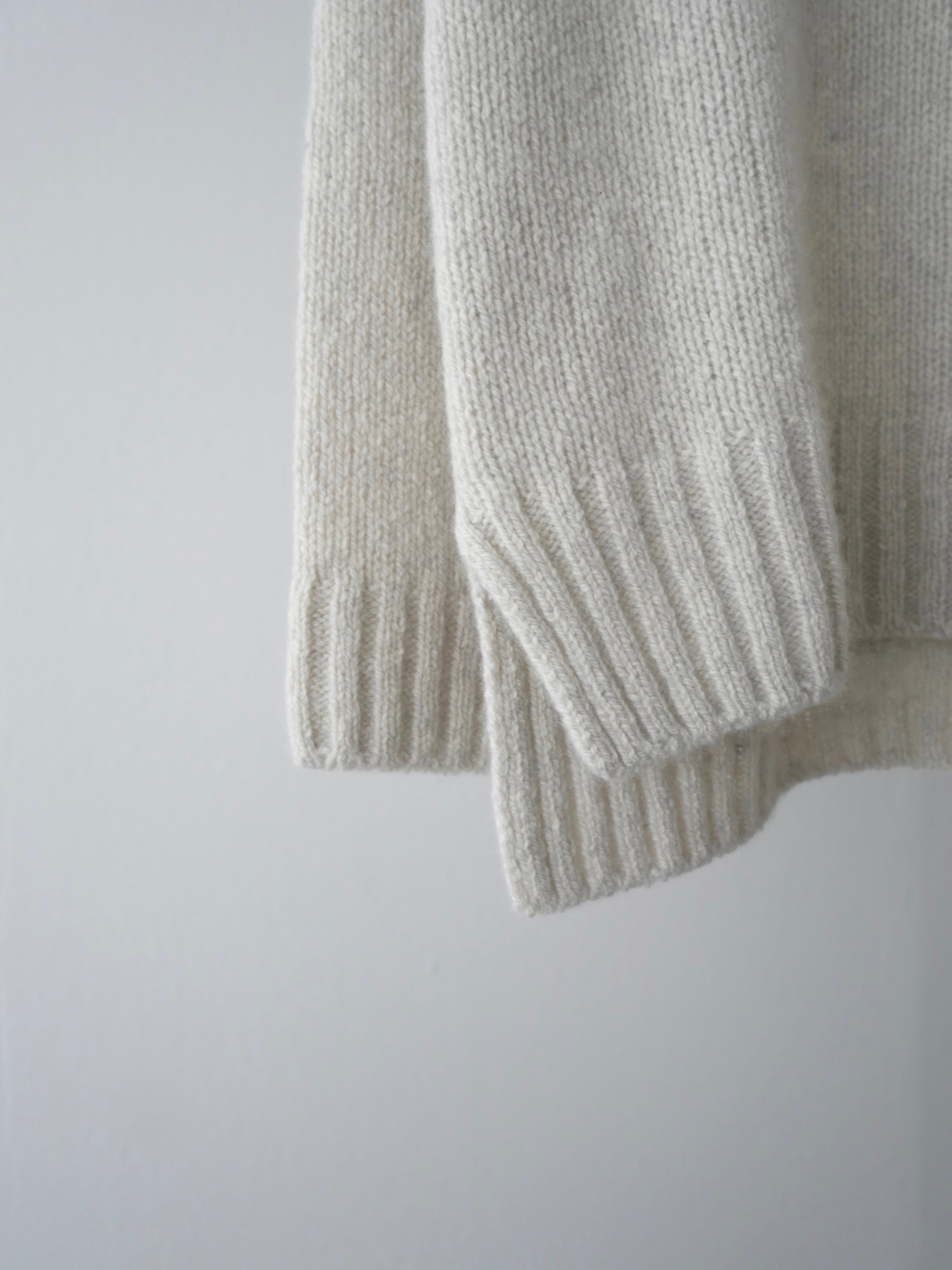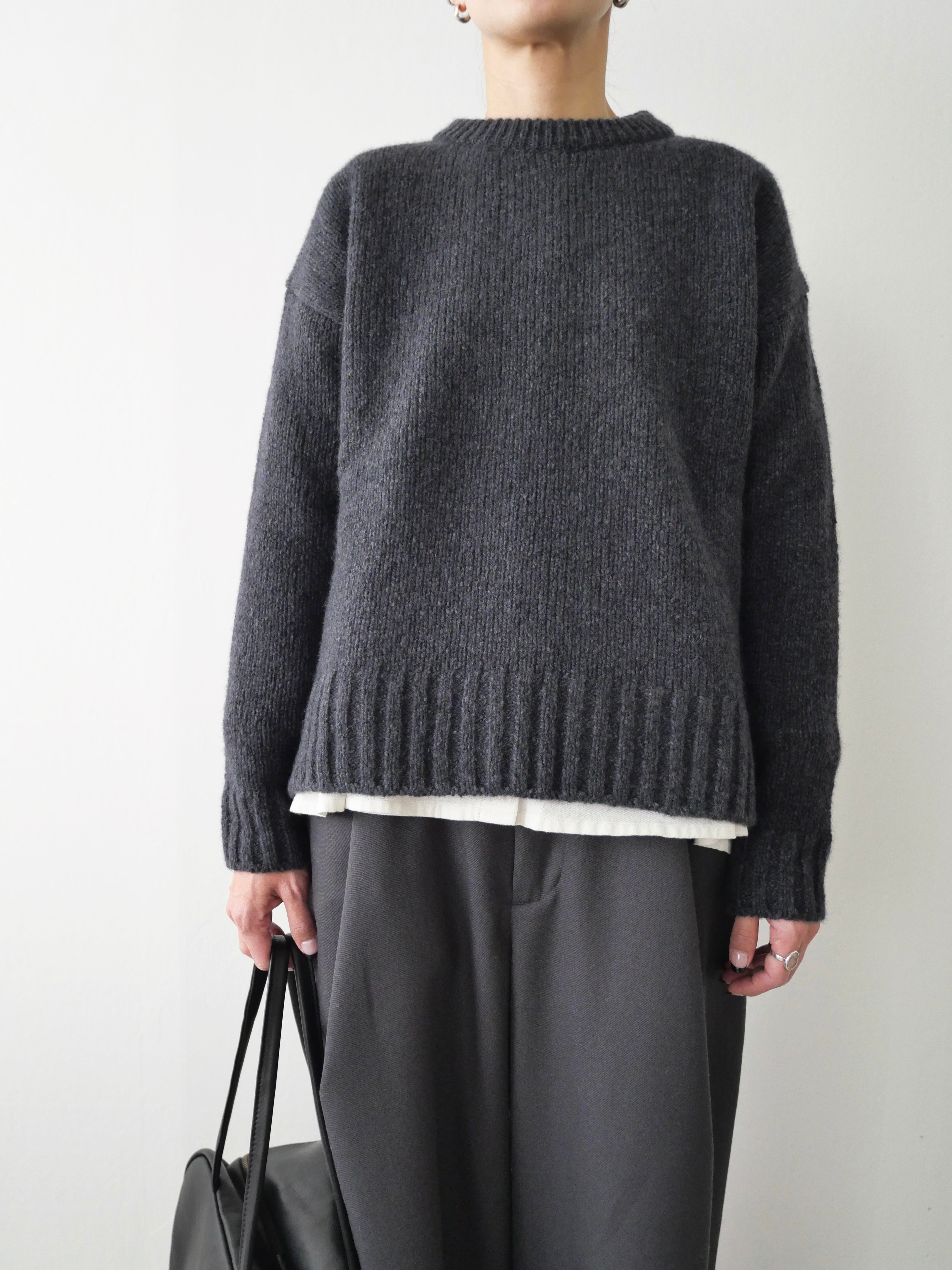 手紡ぎのような自然な素材感が出るように、スラブ調に紡績したカシミヤ100%のローゲージのシリーズです。スラブ調の糸は編むとやわらかな凹凸のある表情が生まれます。軽い着心地ながら、空気を含んだ太い糸のため身体をしっかりと暖めてくれます。シンプルな形のプルオーバー。首元と裾のリブが印象的なアイテムです。
