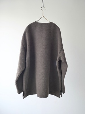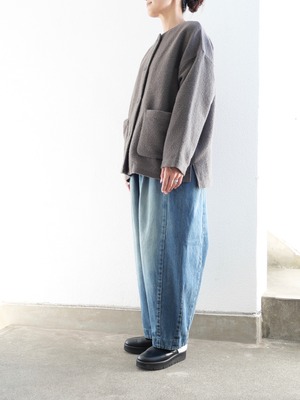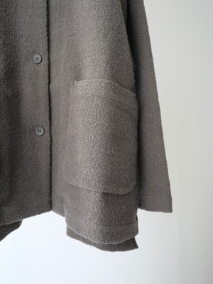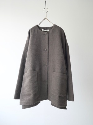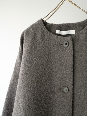 表には不規則的なループ状のウールブークレー糸を、裏にはコットン糸を使用した、表情の豊かなオリジナル生地です。冬の入りを感じるような表情ですが、見た目よりさらりと軽い着心地で、秋にも手軽に取り入れられるアイテムです。ゆったりとしたサイズ感なので、冬は厚手のニットの上にも着ていただけます。ジャケットはノーカラーですっきりと。