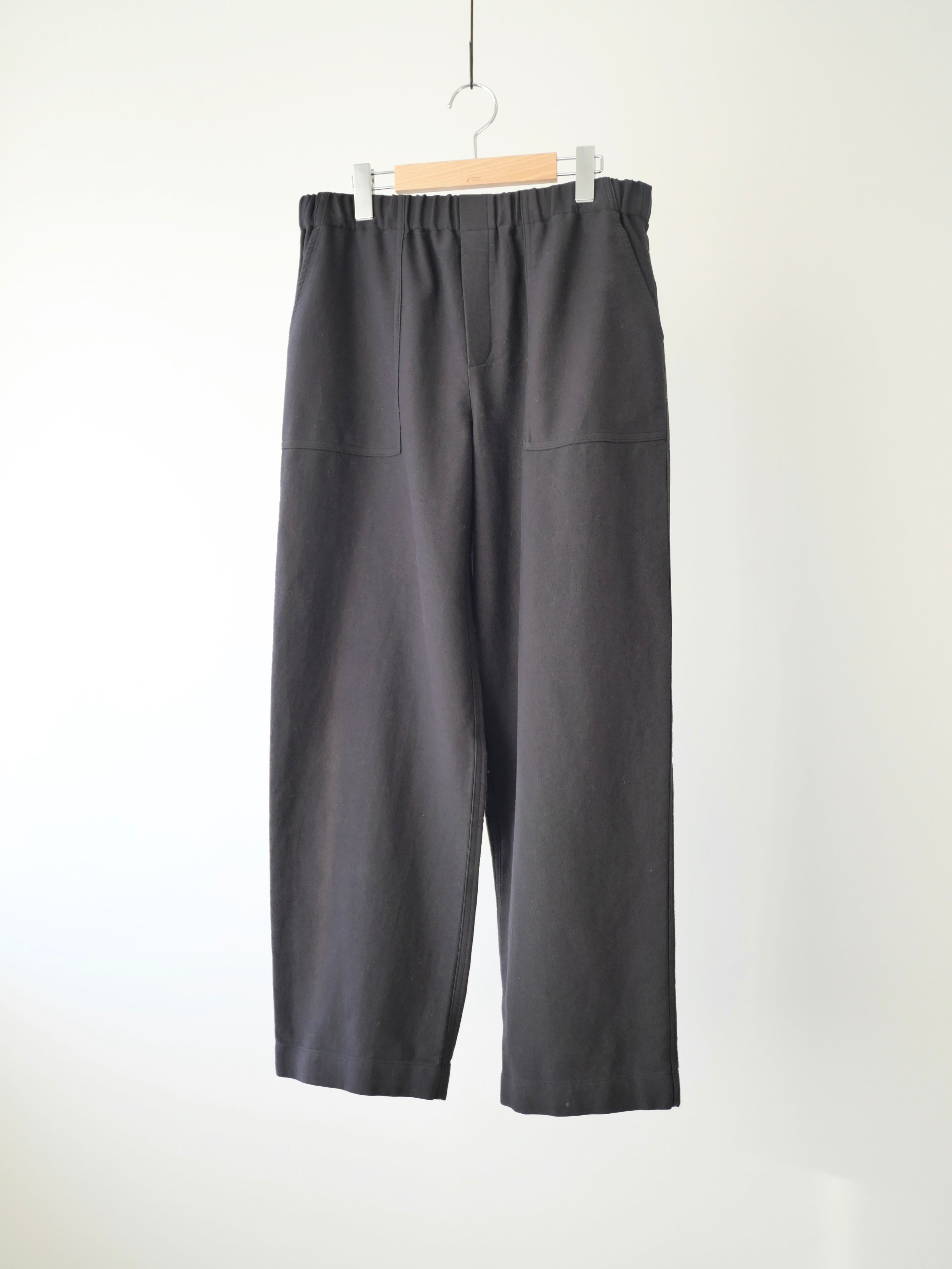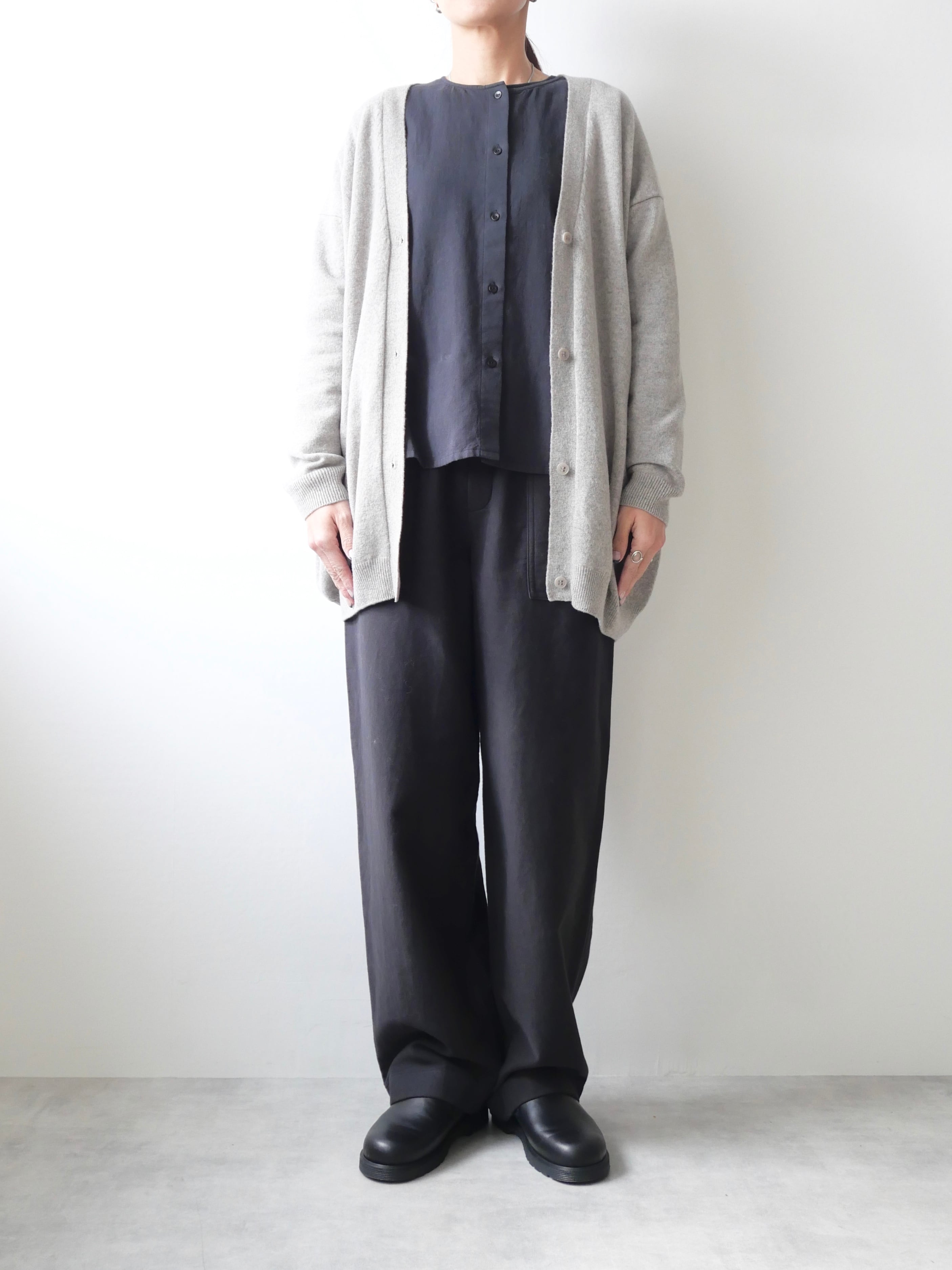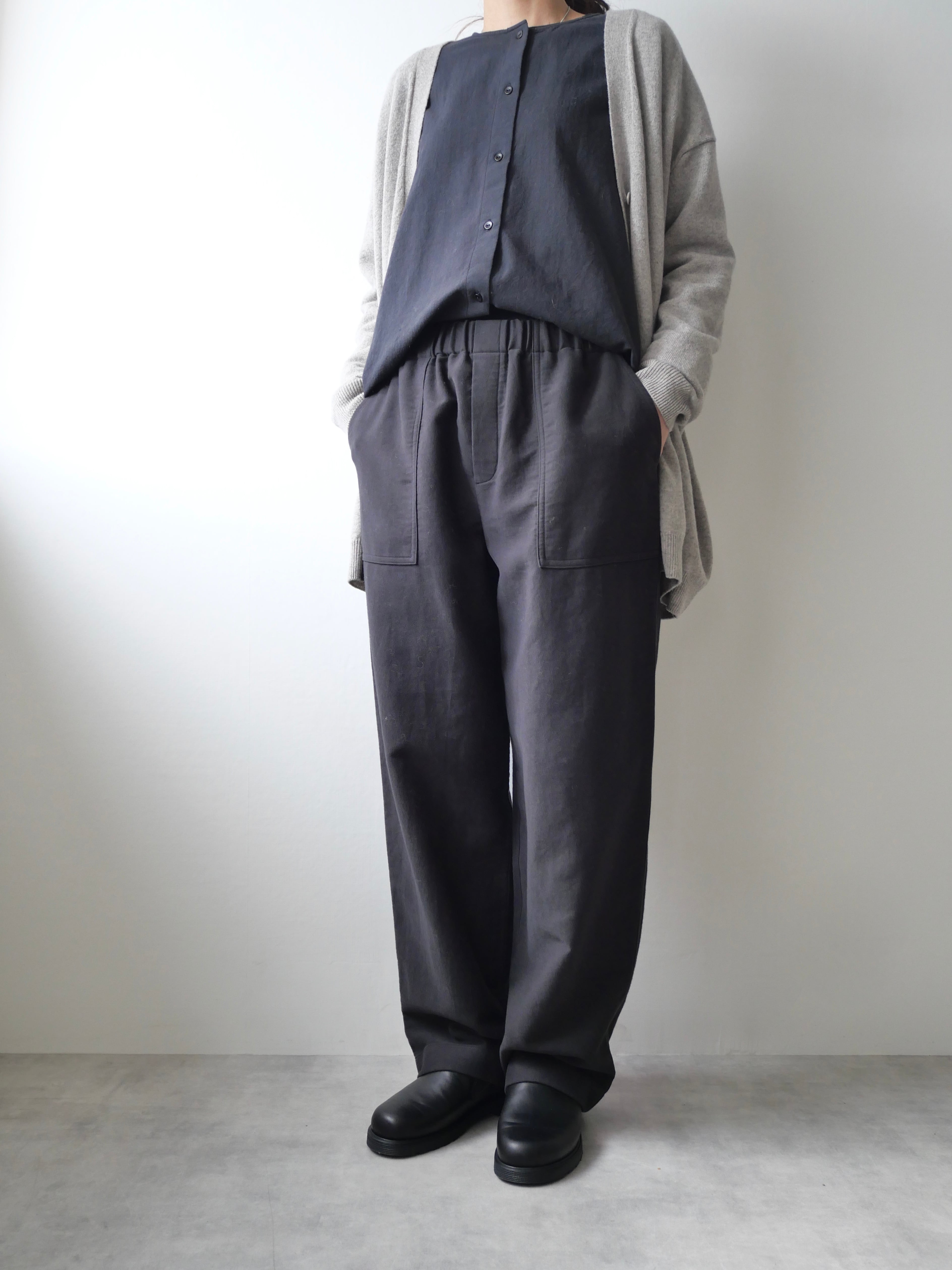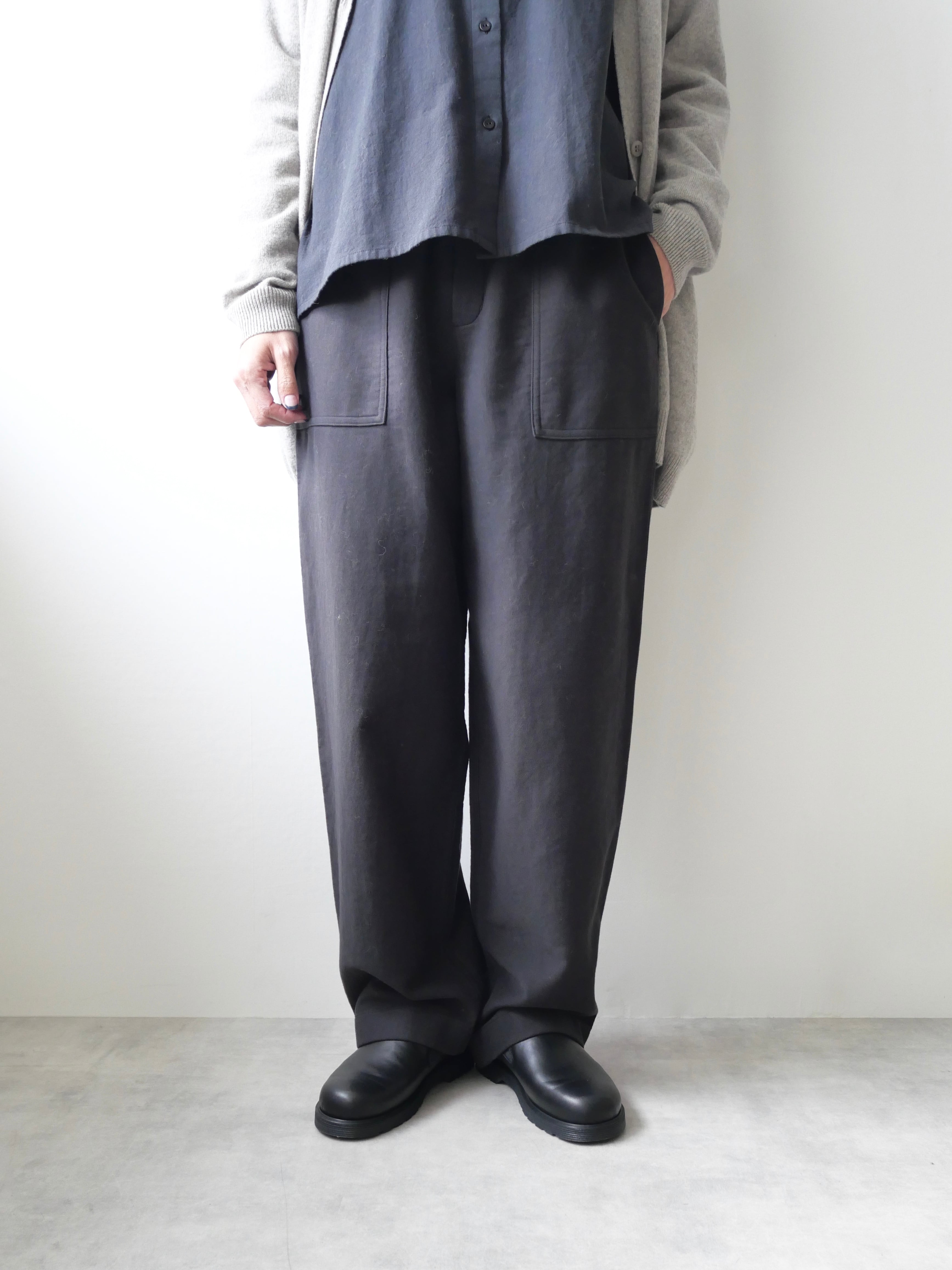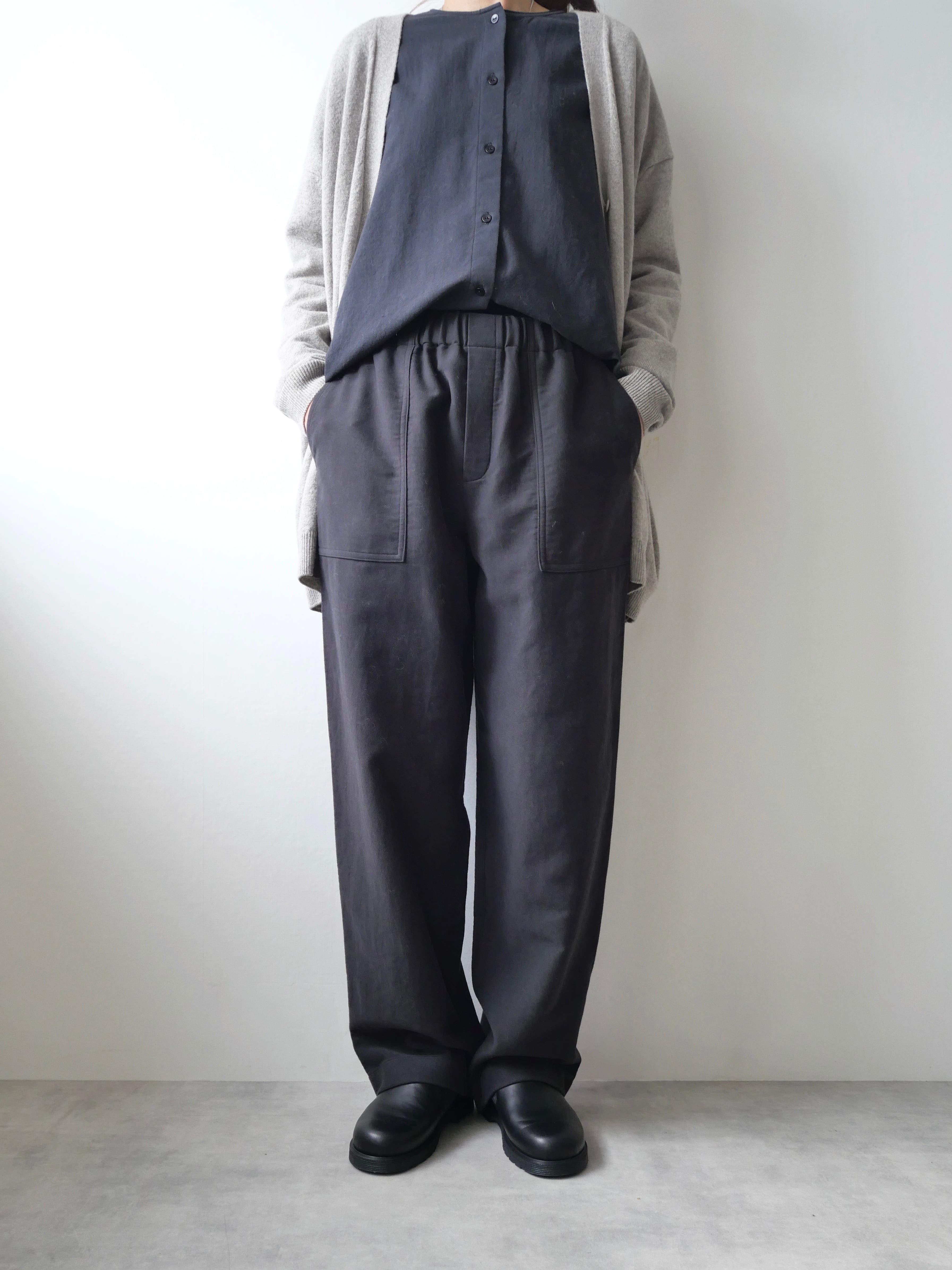 生地表面に細やかな毛羽立ちを感じるコットンのモールスキン生地。かつてはワークジャケットなどに使用されていたほどの丈夫さから、今季はカジュアルなパンツを揃えました。暖かさを感じる丈夫な厚みの生地ながら、肌あたりの柔らかなやさしい履き心地です。シンプルなデザインで使い勝手のよいワイドパンツは、シーズン問わずさまざまなコーディネートをお愉しみいただけます。