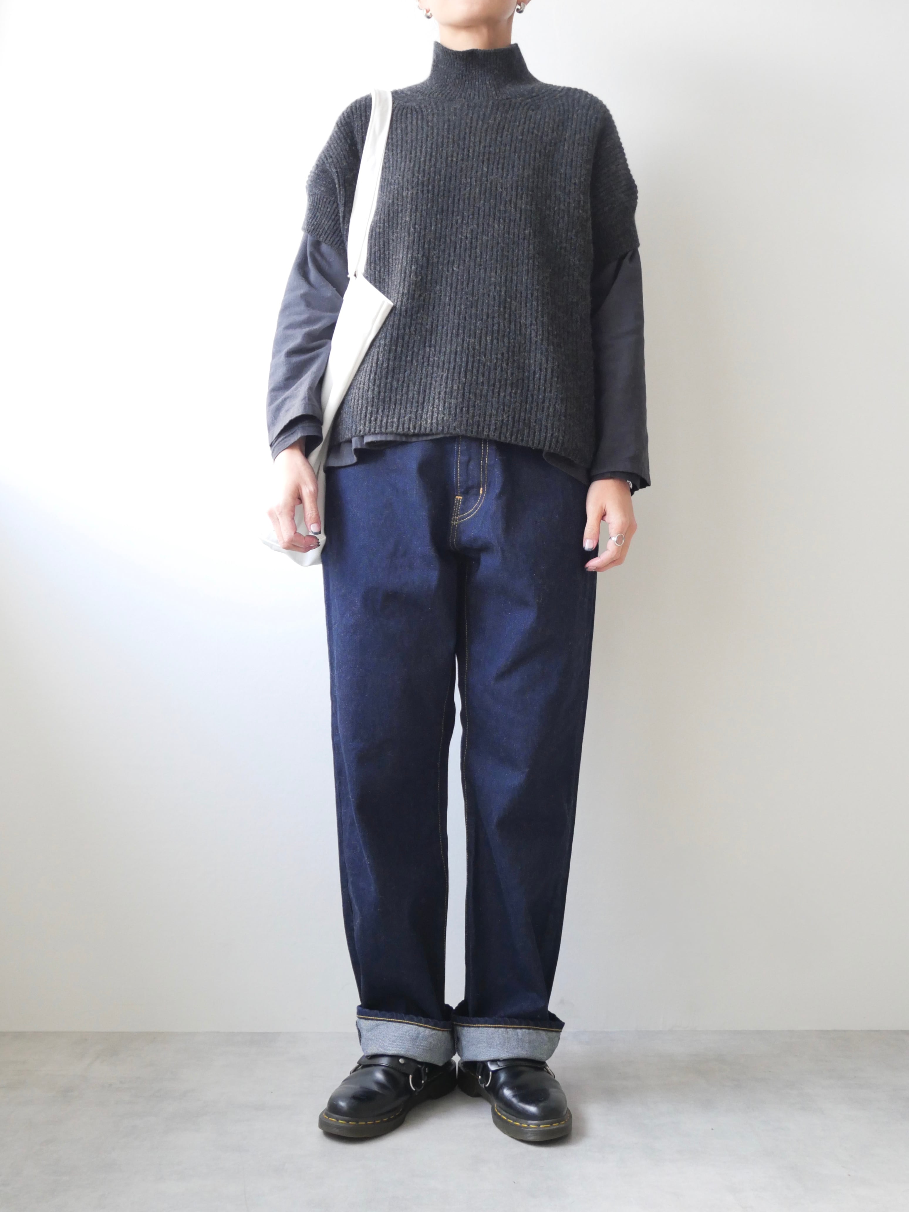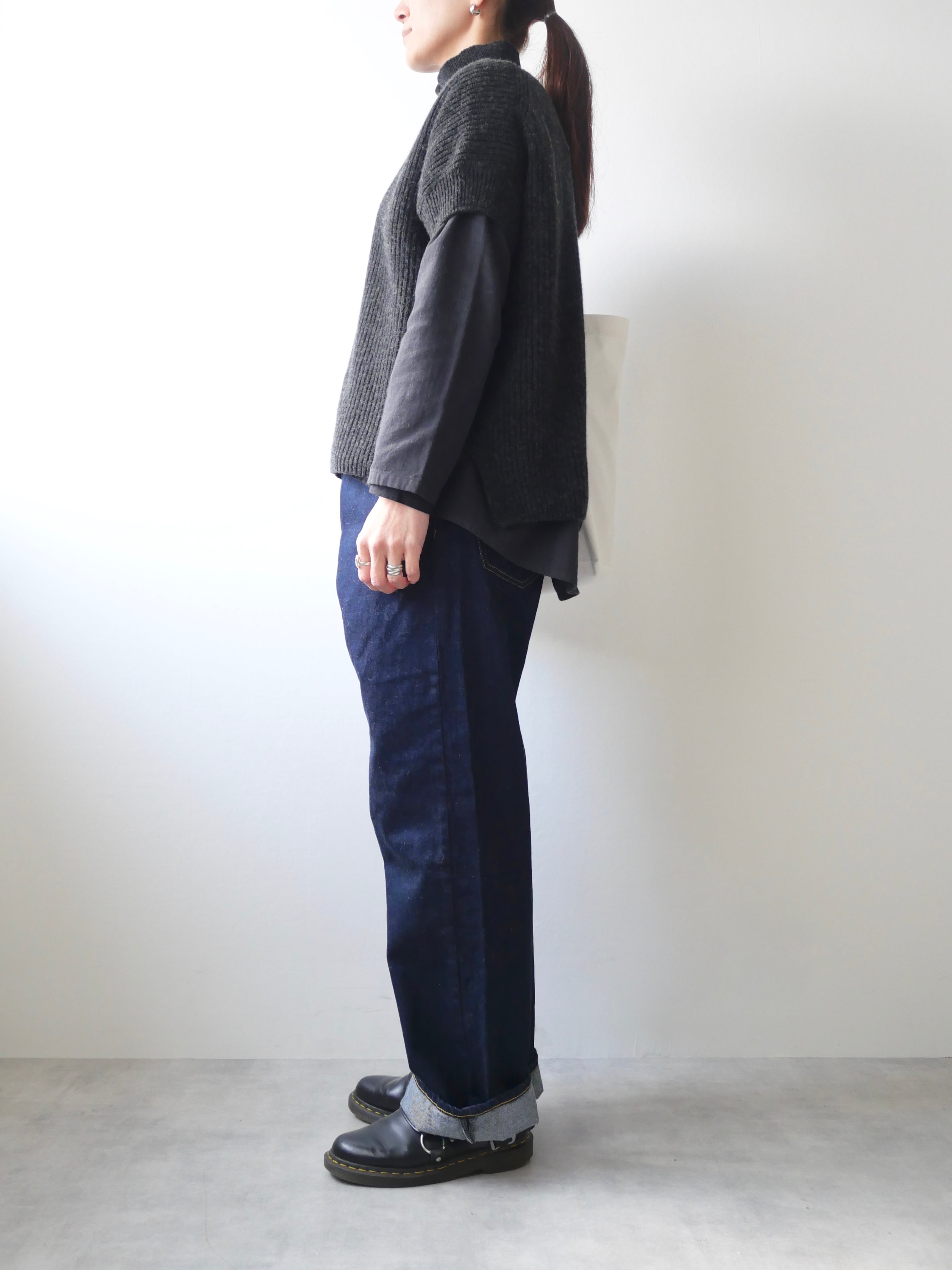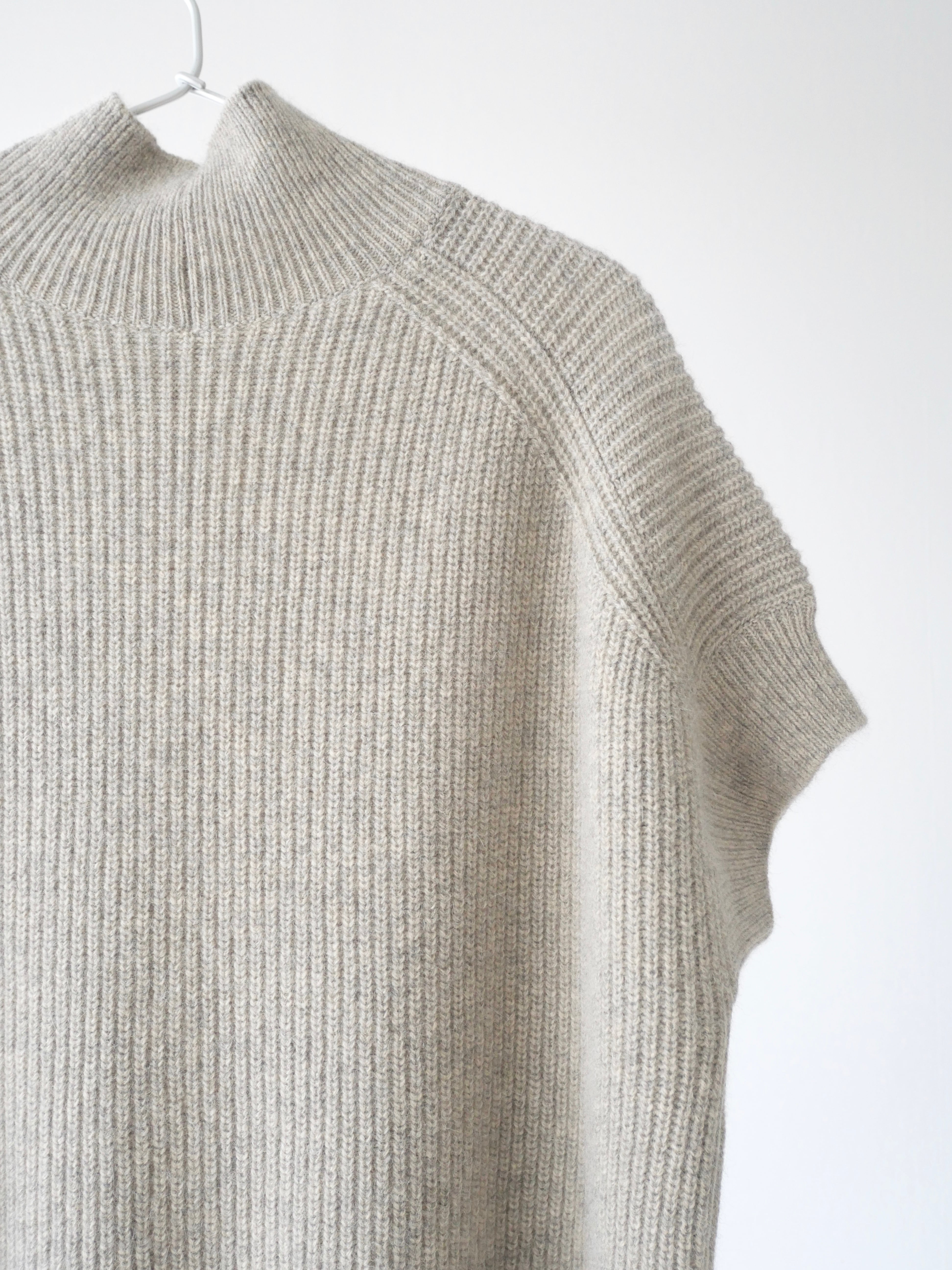 弾力のあるメリノウールと、ふんわりとした毛がしなやかでやさしい肌当たりのブルーフォックスをブレンドした素材。数色を混ぜ合わせて染色をしているため、ナチュラルで味わい深い色合いに。ふわりと軽やかな着心地で、カシミヤやウールと並ぶほどの保温性をもちます。畦編みをほどこしたベストは首元まであたたかく、日々の暮らしの中でも使いやすいアイテムです。