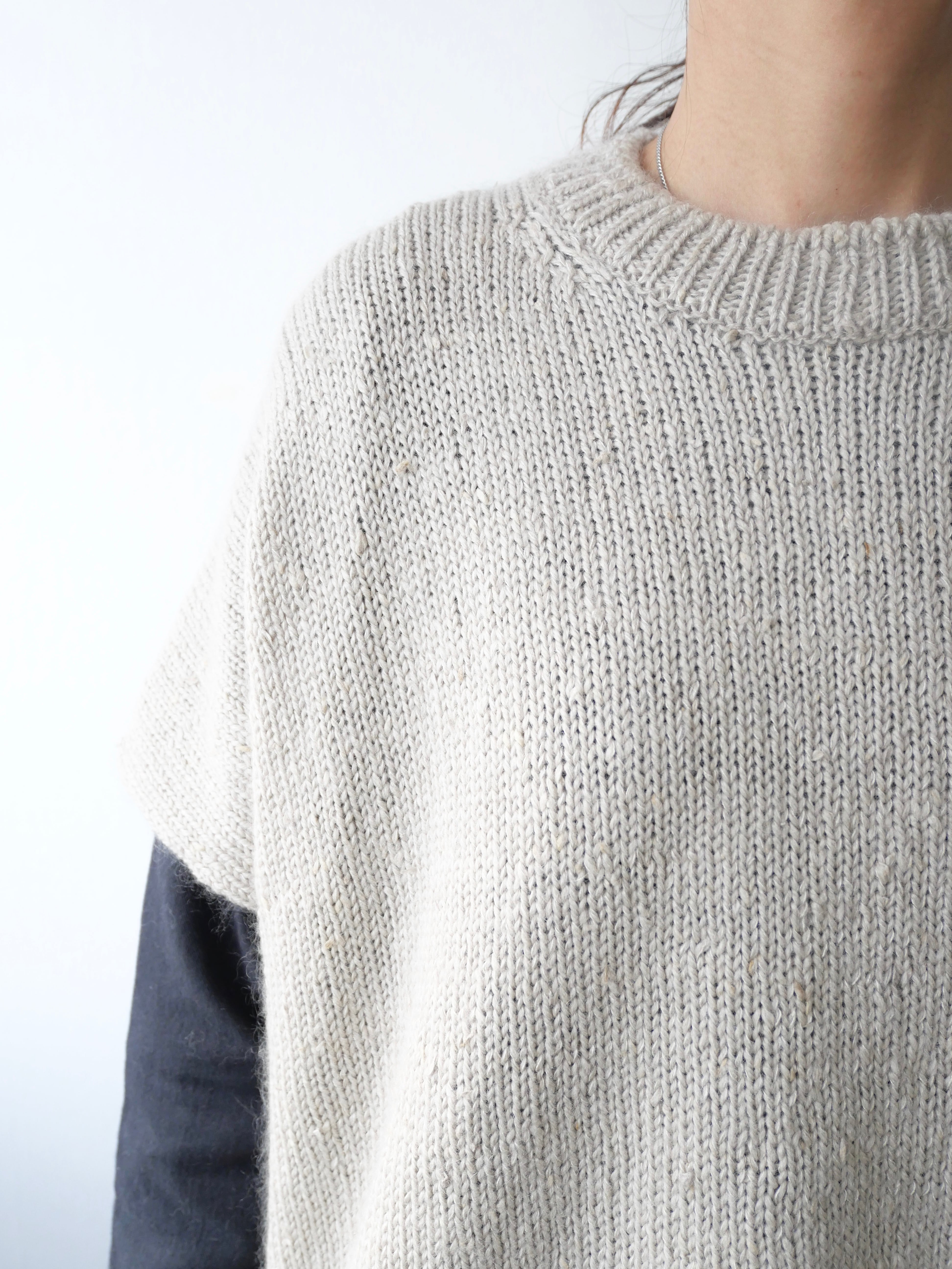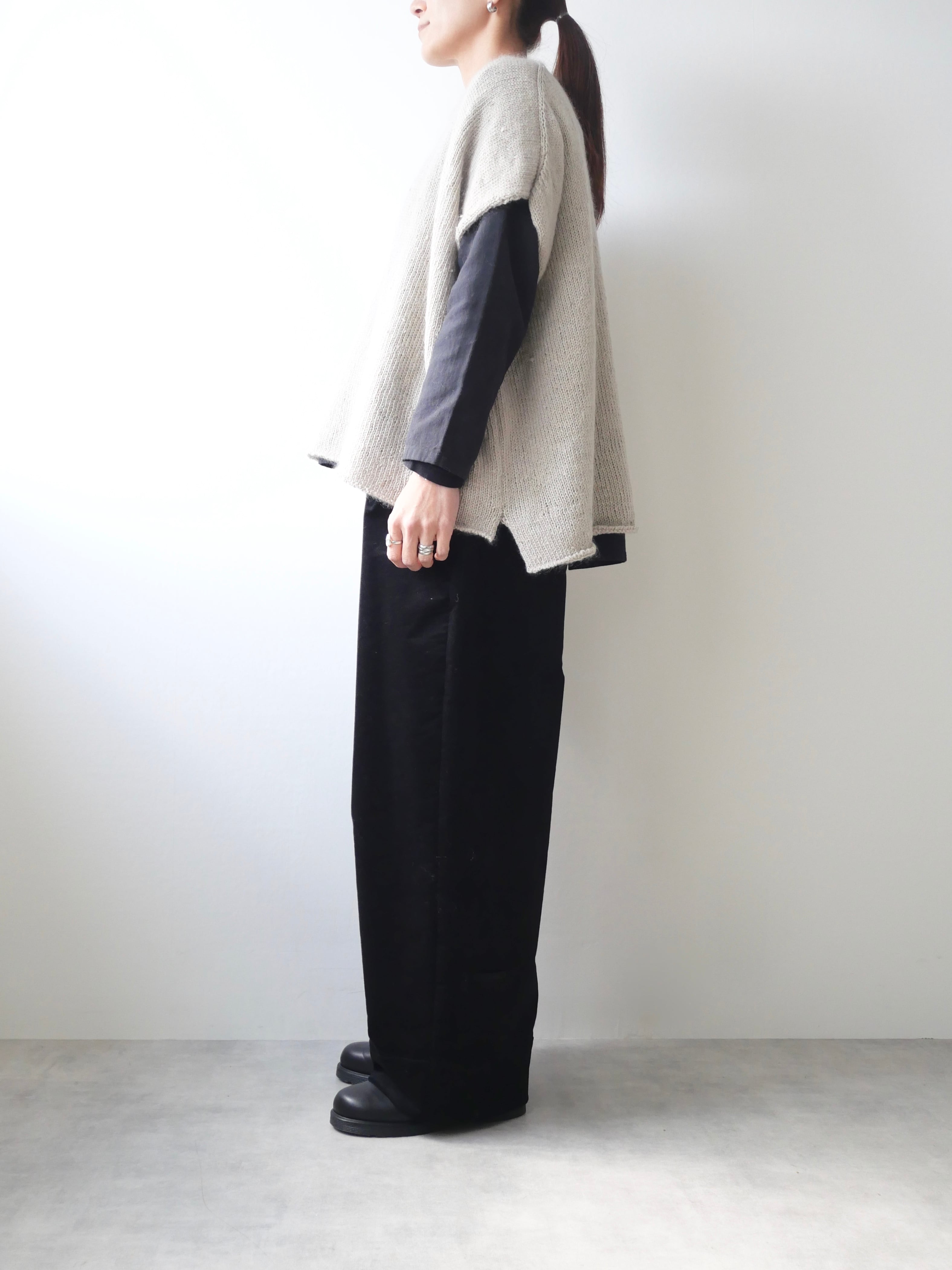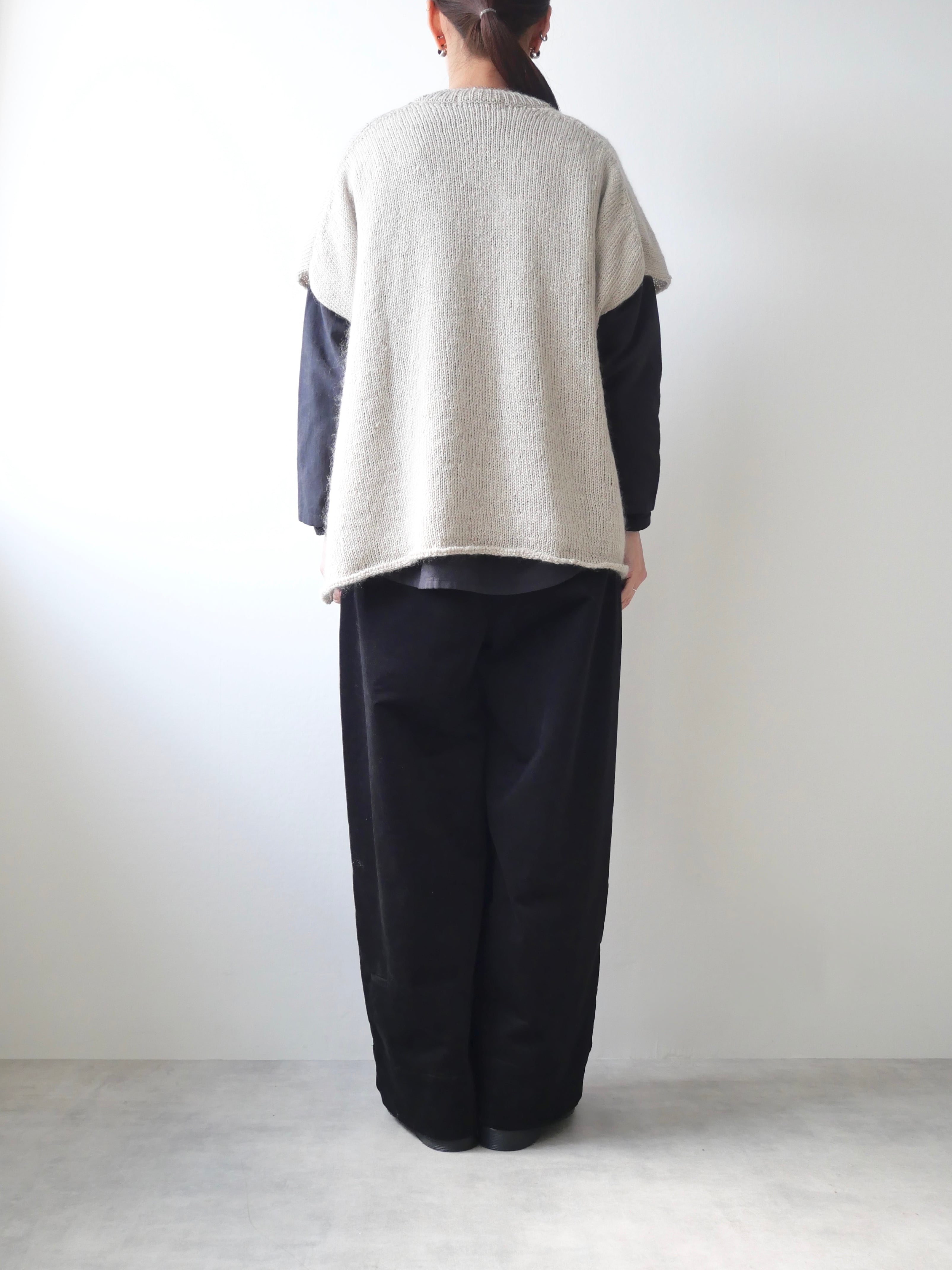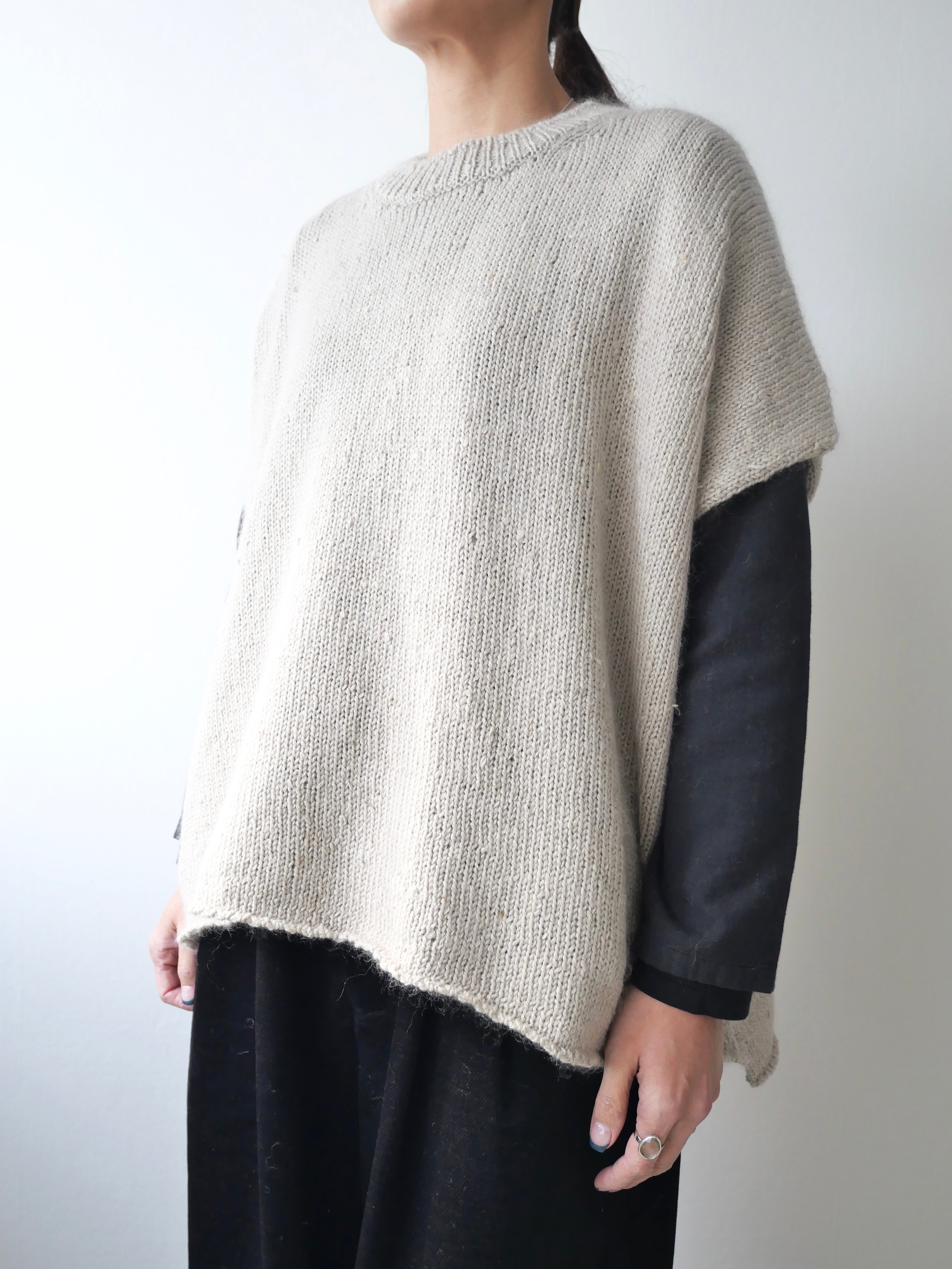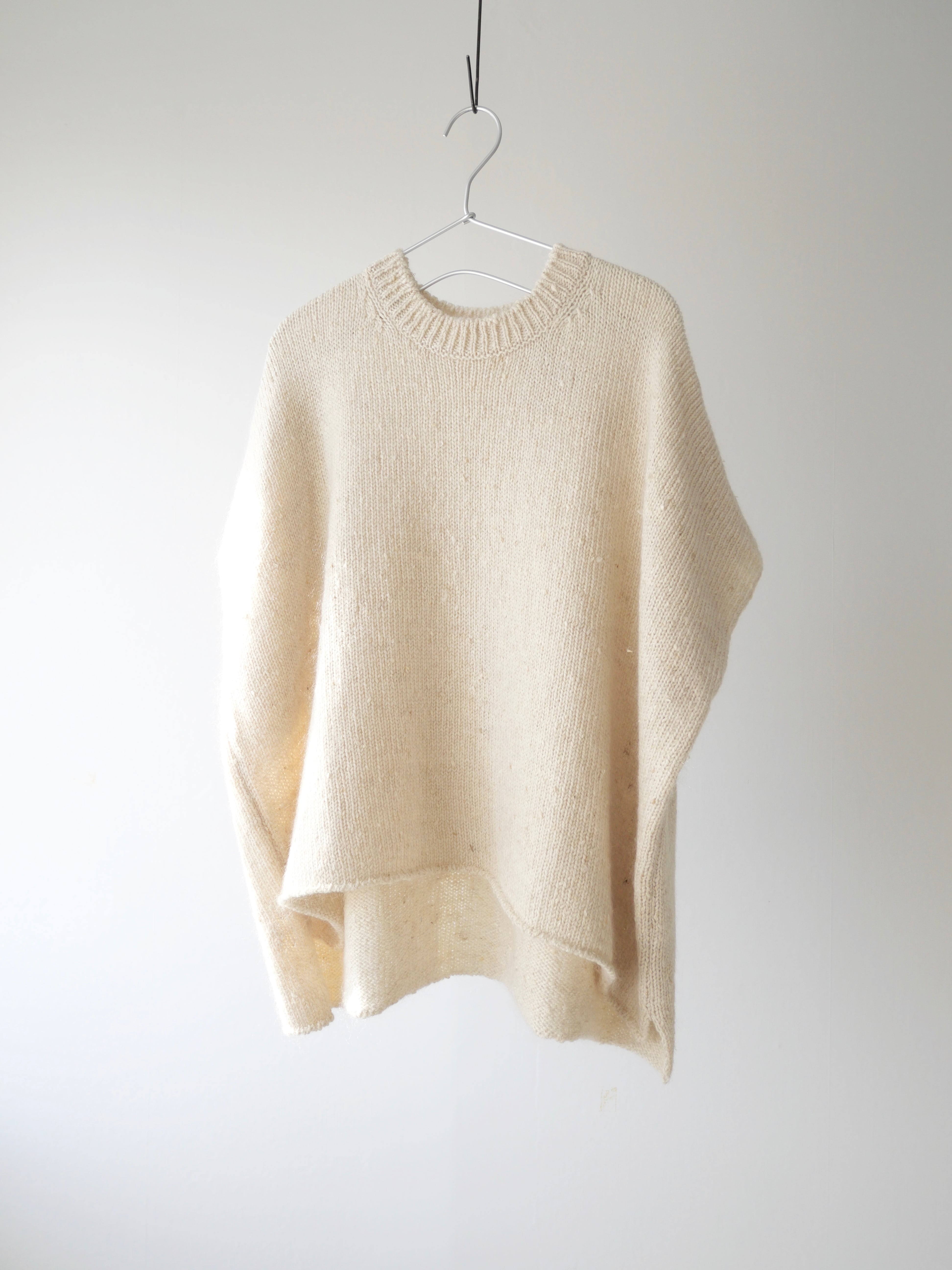 シルクの繭を取り出す際に、本来ならば除去されてしまう「繭毛羽」と呼ばれる繭の外側の綿を使用しています。地元養蚕農家より原料を譲り受け、無駄なく使用できる方法を思考し、素朴な表情のあるニットにしました。メリノウールとスーピマコットンを繭毛羽にブレンドした糸にシルクモヘアの糸を合わせて撚糸した、表面が少し靄がかかったような表情をもつ素材です。ポンチョはふんわりと身体をあたたかく覆いつつ、印象的な装いに。