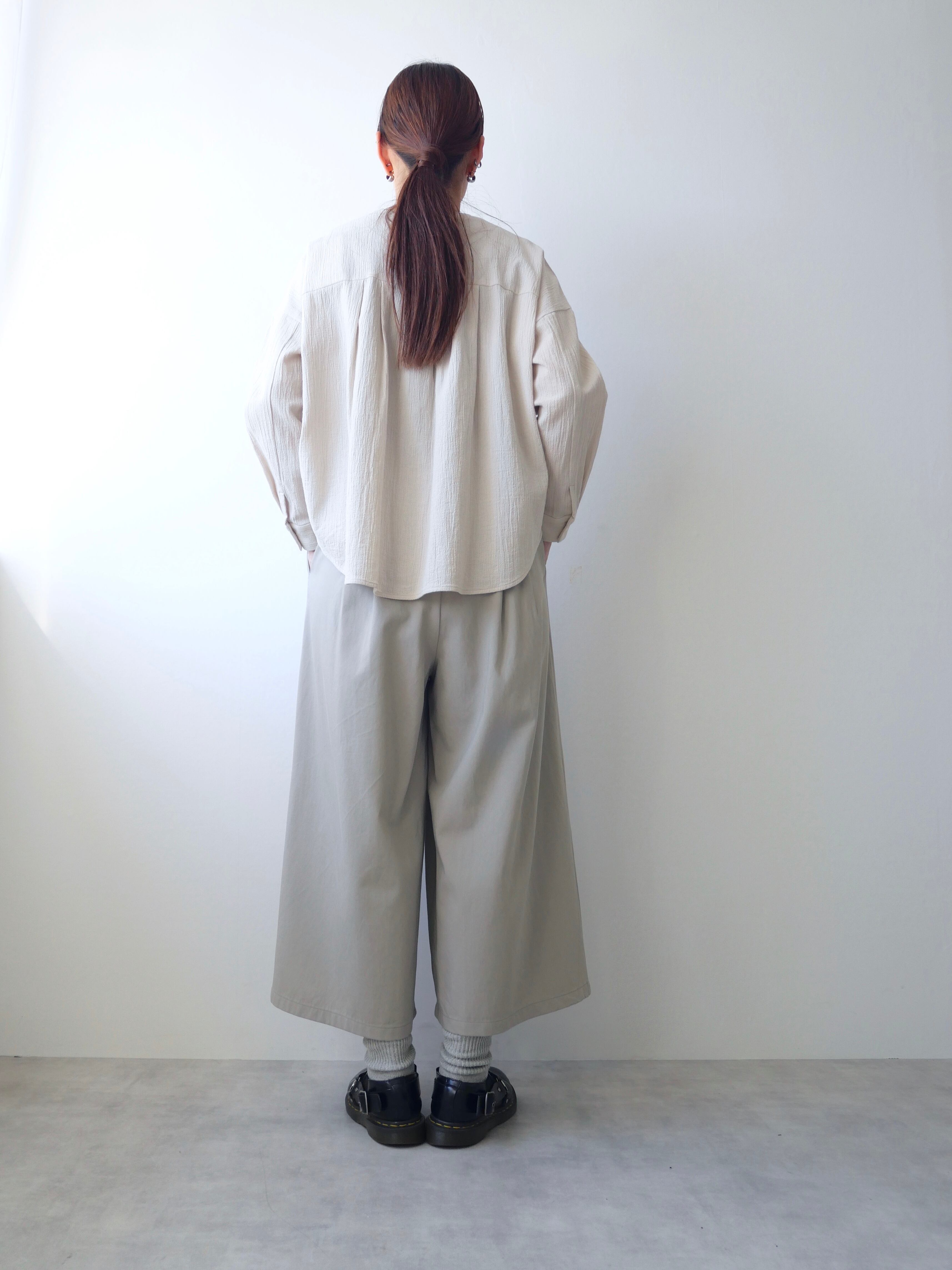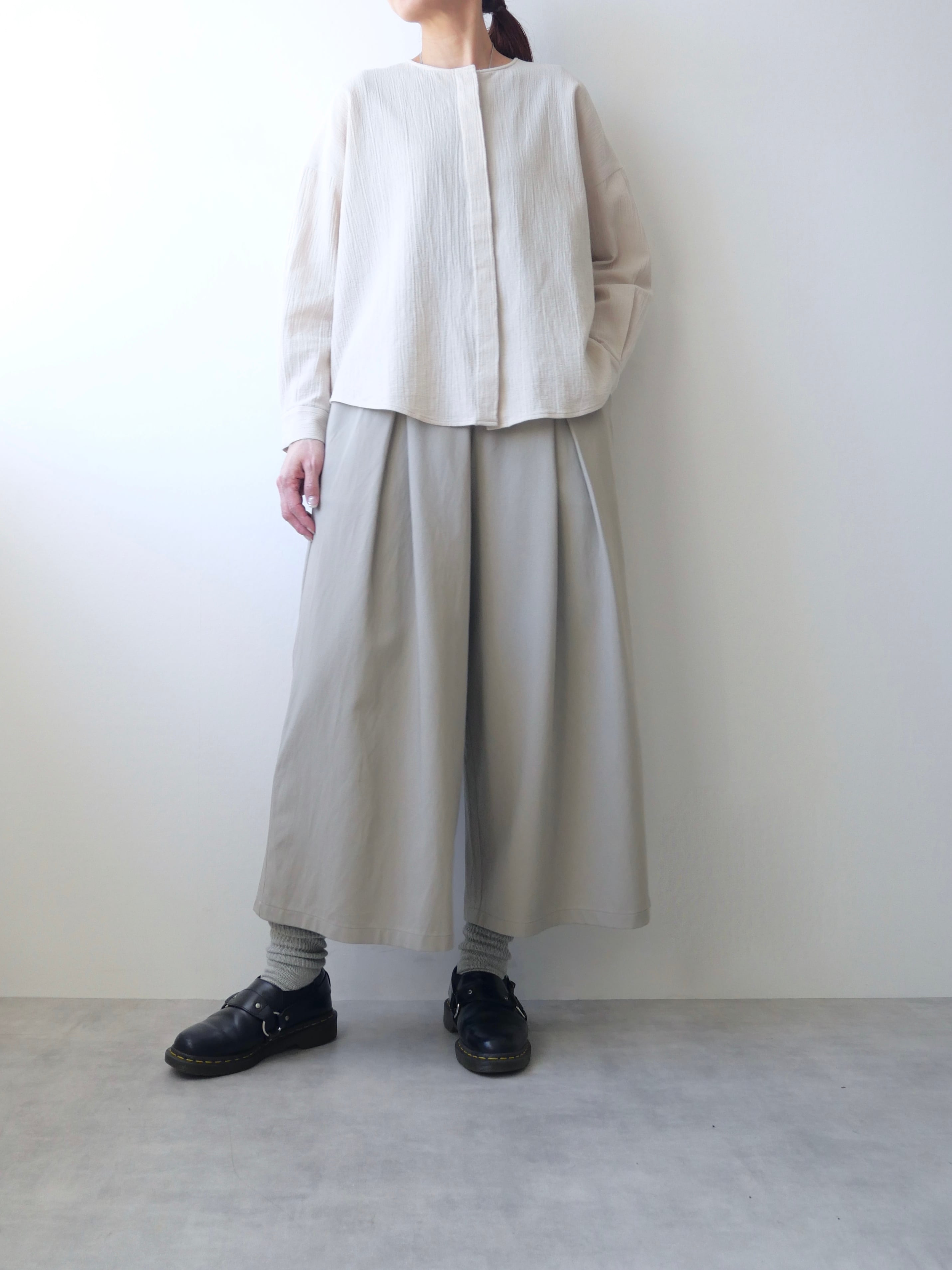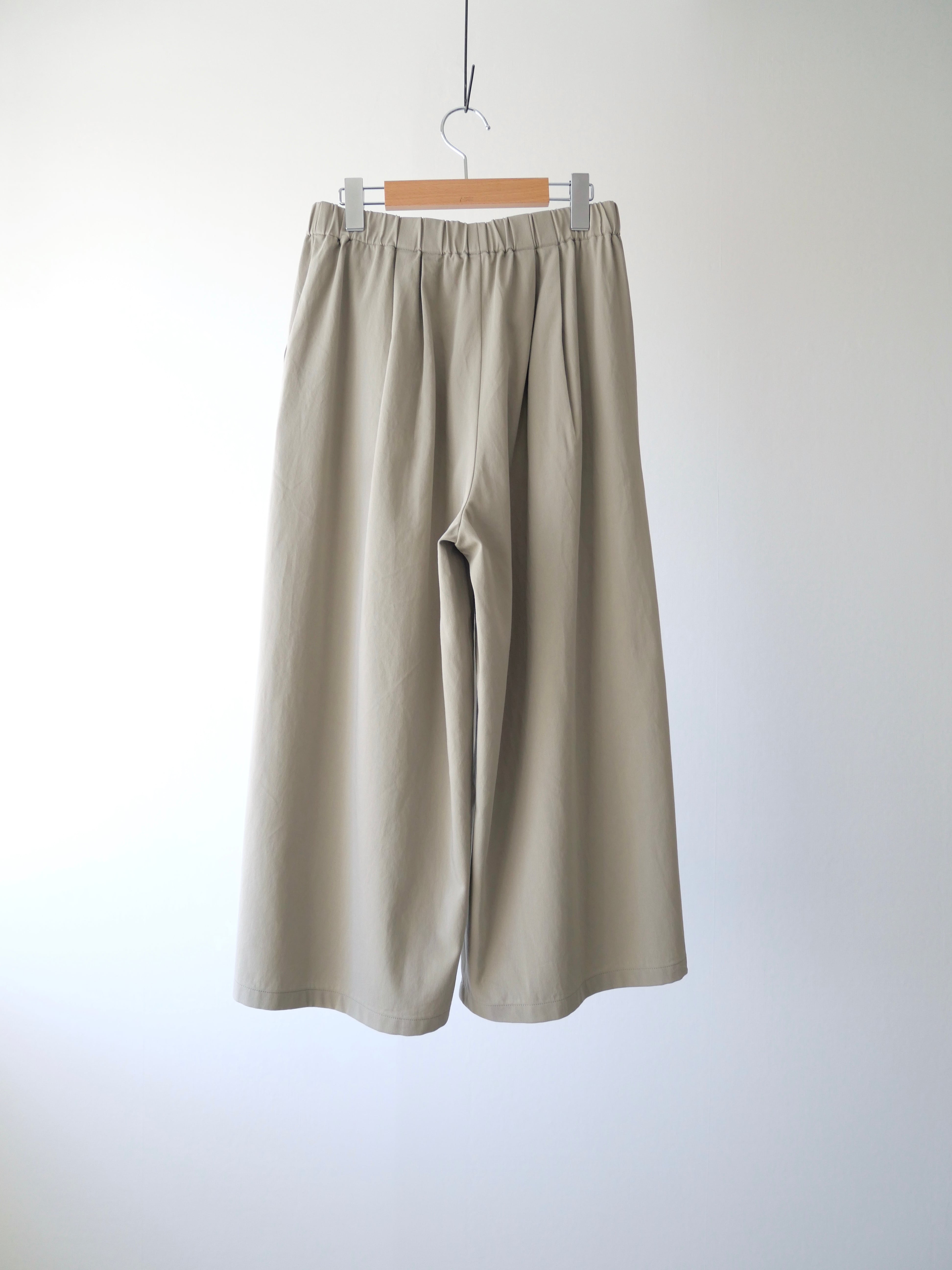 タックから広がるドレープと程よいフレア感が女性らしい印象のキュロットパンツ。程よい厚みとしなやかさのあるコットン素材の生地で仕立てました。